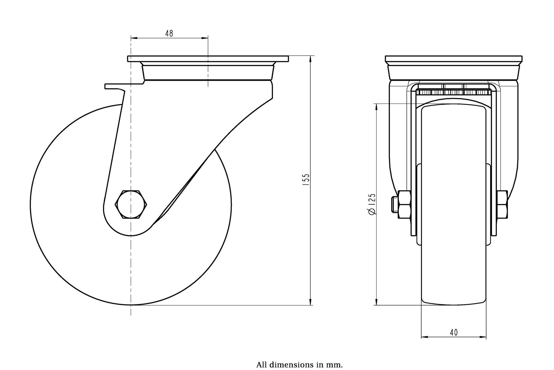 Swivel castor with strong top plate bracket made of stainless steel with double row ball race in swivel head (material no. 1.4301/AISI 304), with dust protection ring.