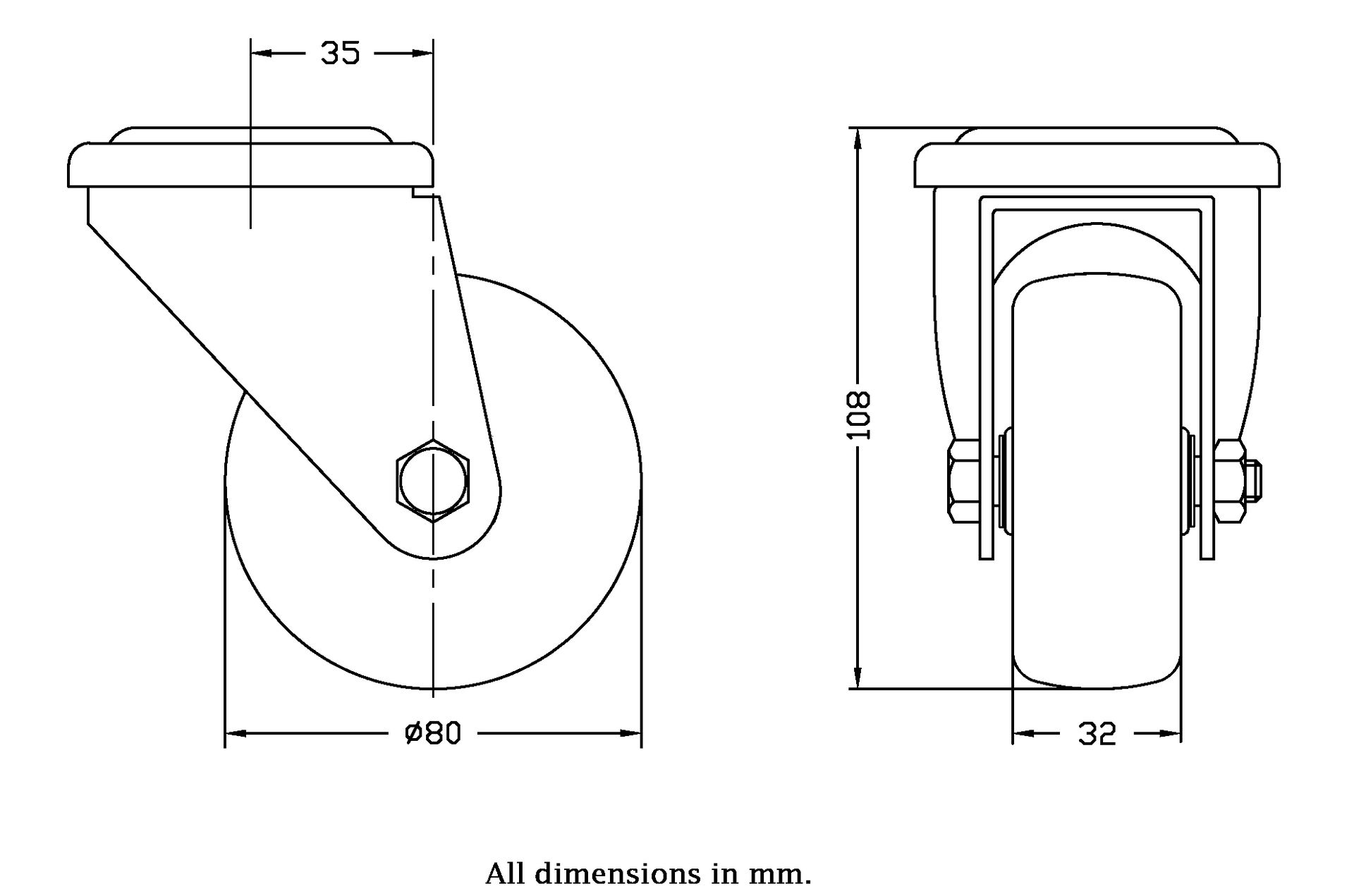 Swivel castor with bolt hole bracket made of zinc plated steel with double row ball race in swivel head.