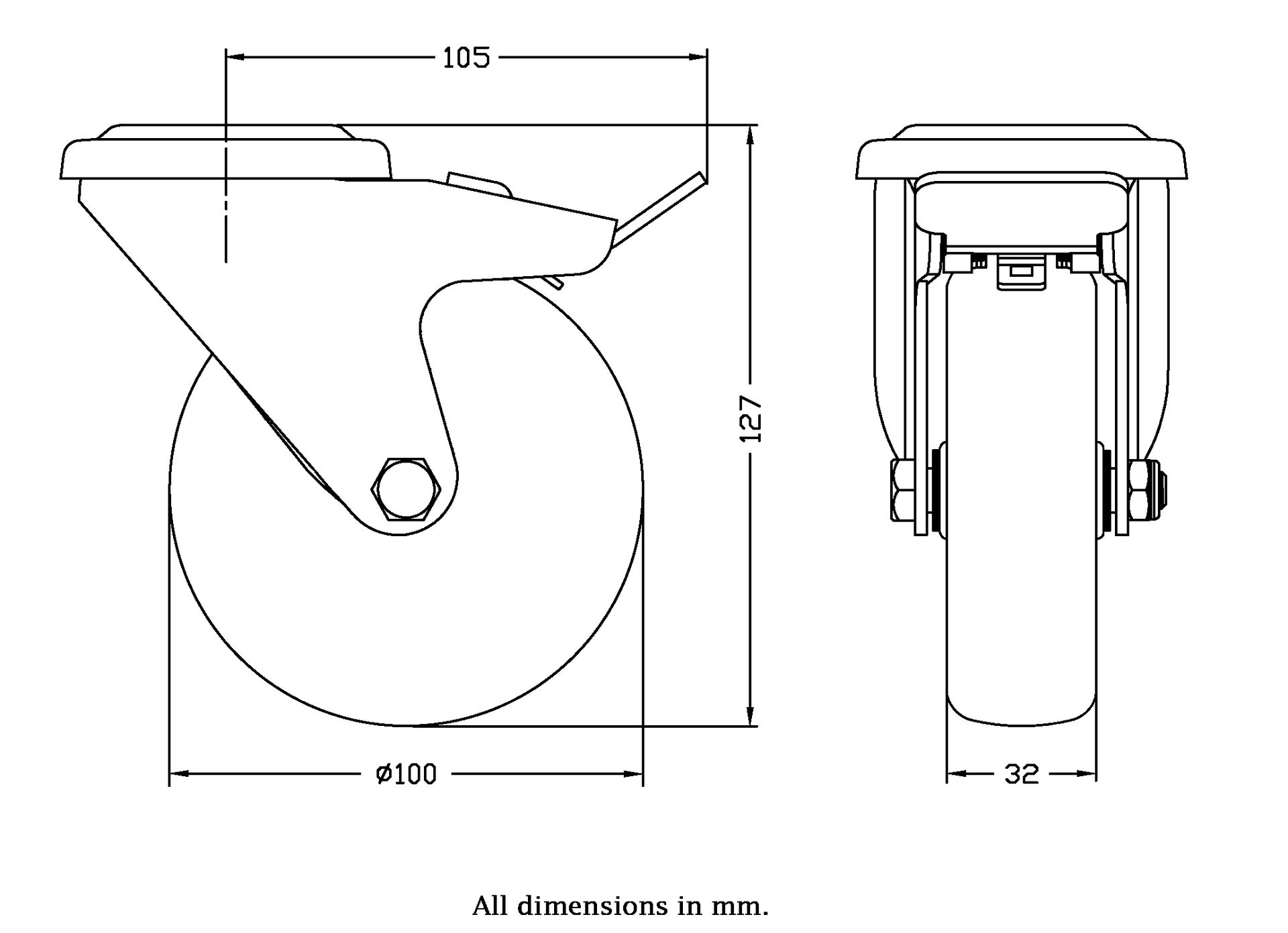 Swivel/brake castor with bolt hole bracket made of zinc plated steel with double row ball race in swivel head.