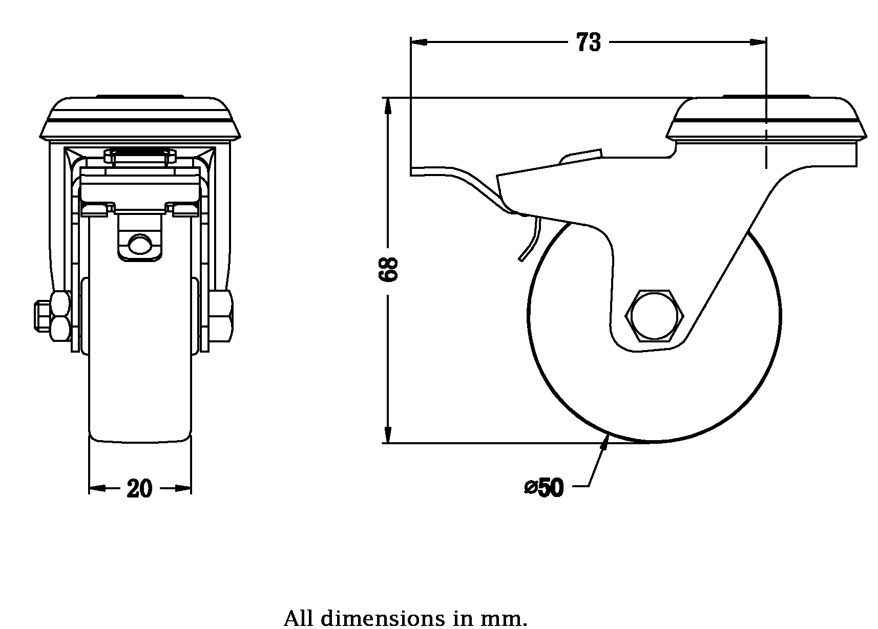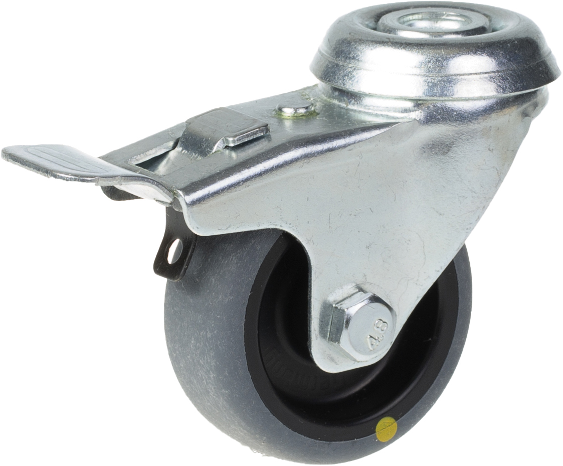 Swivel/brake castor with bolt hole bracket made of zinc plated steel with double row ball race in swivel head.