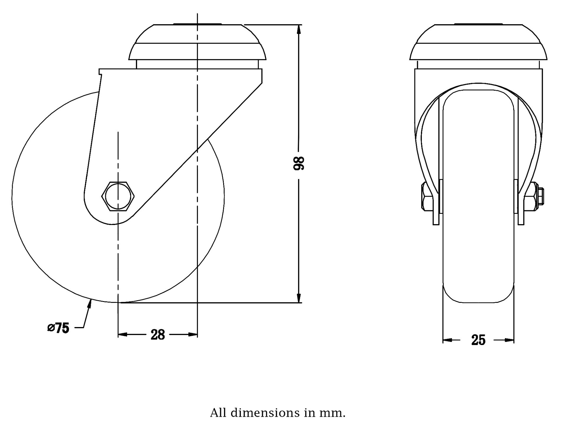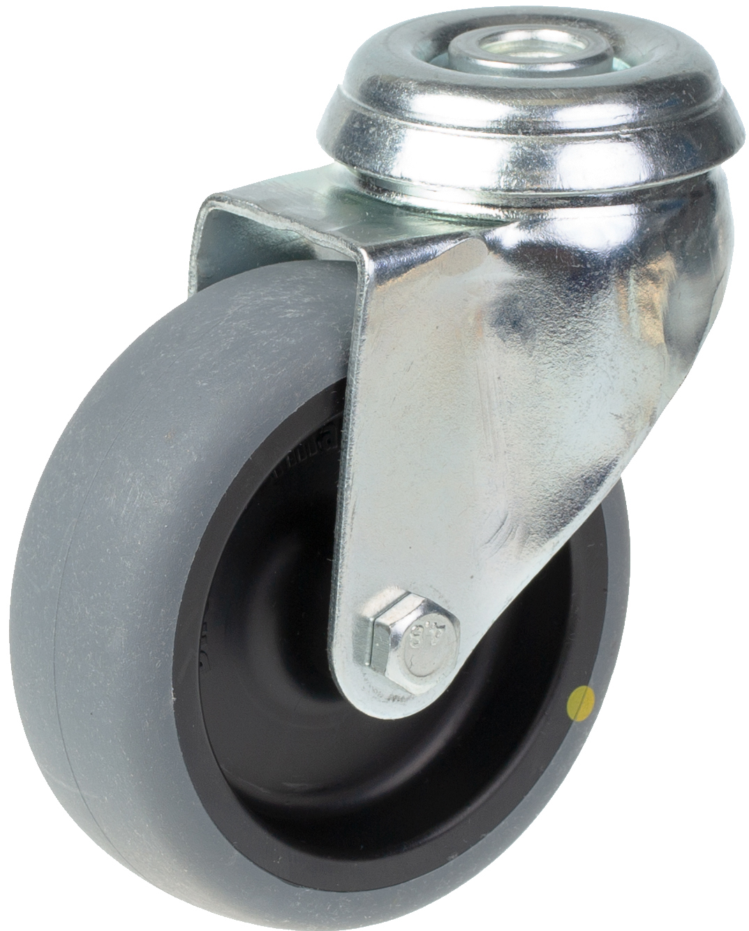 - Swivel castor with bolt hole bracket made of zinc plated steel with double row ball race in swivel head.