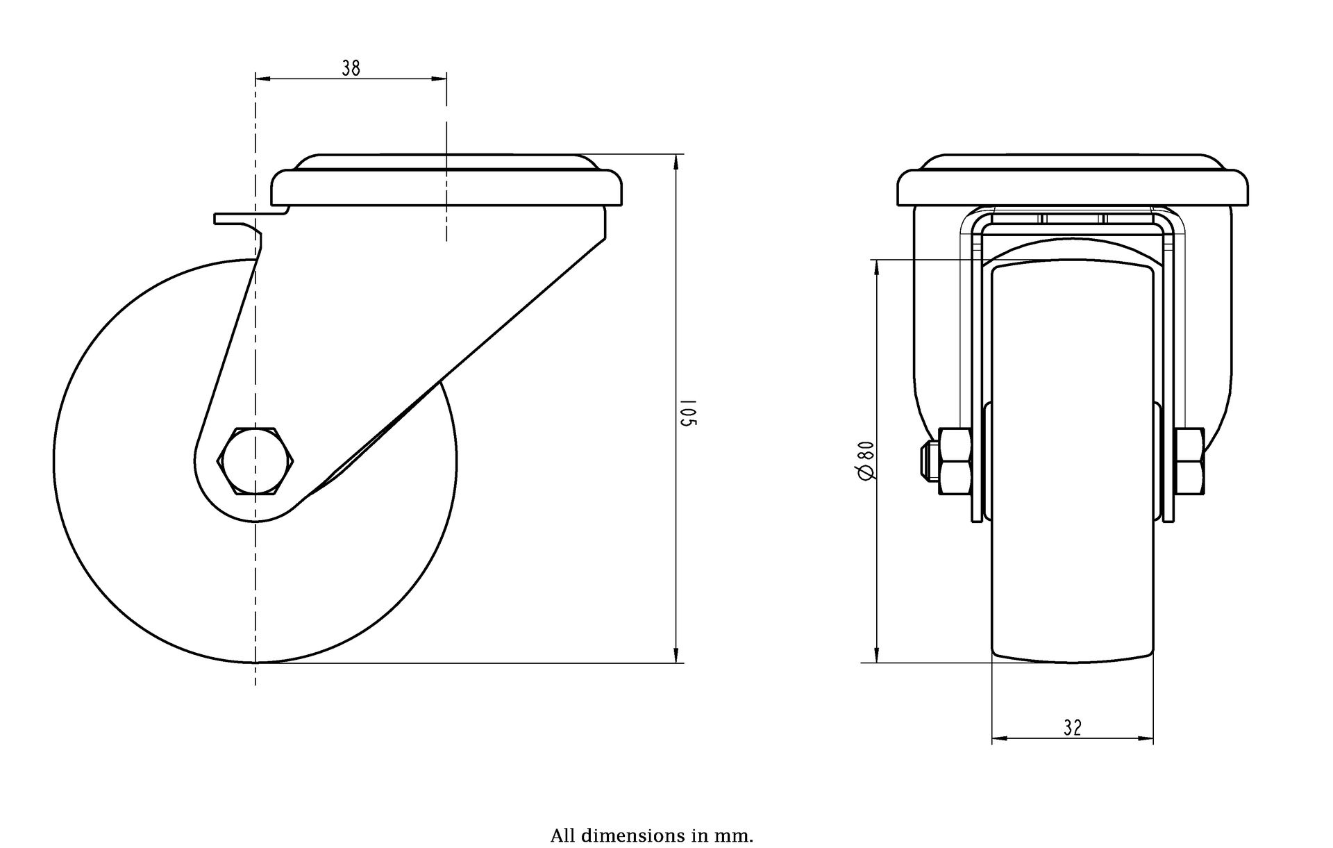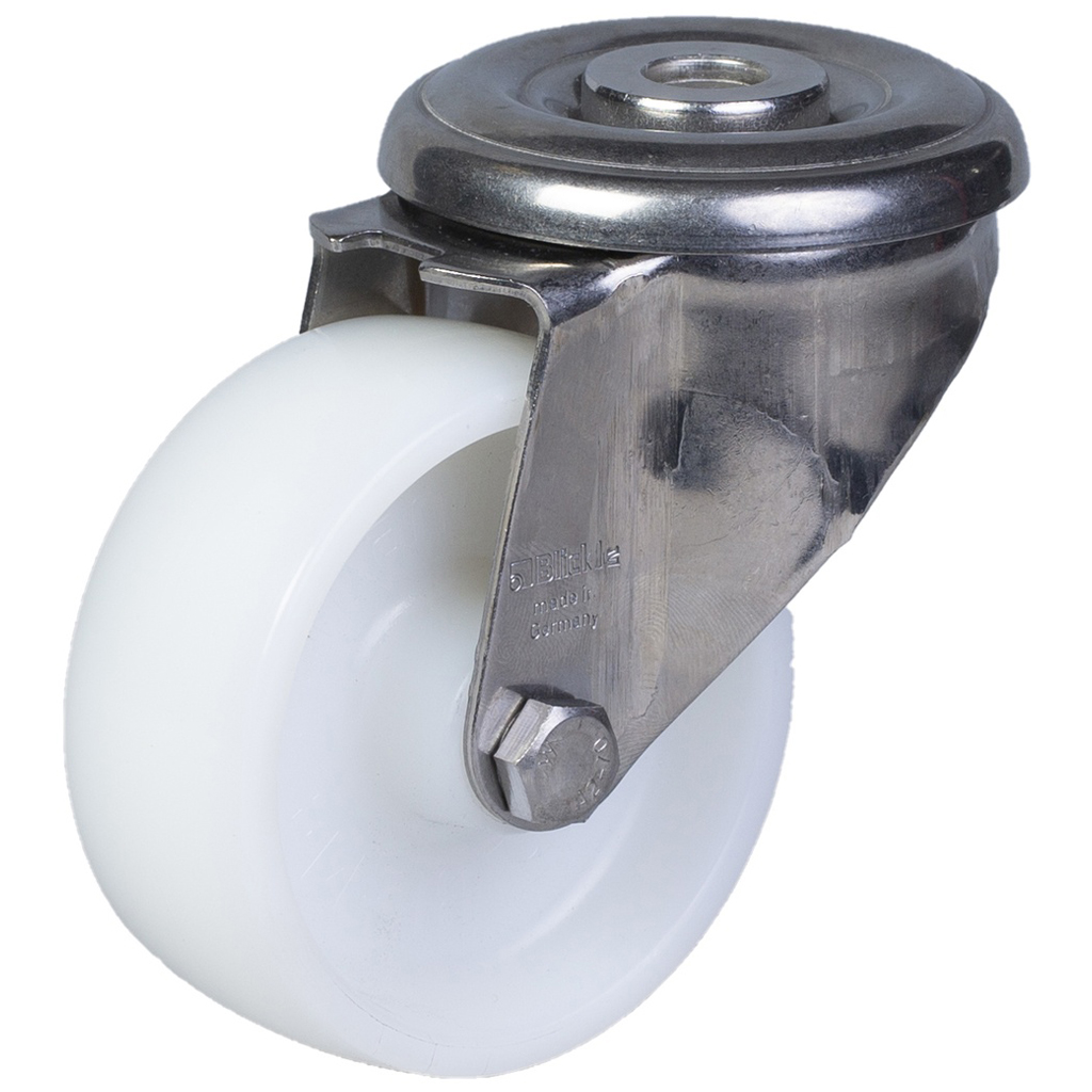 - Swivel castor with bolt hole bracket made of stainless steel with double row ball race in swivel head (material no. 1.4301/AISI 304).