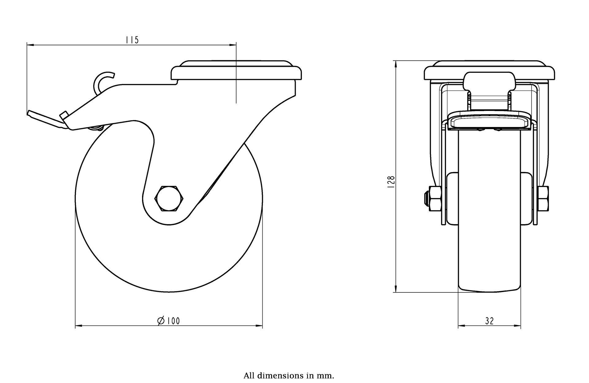- Foot operated brake that locks both swivel and wheel simultaneously.