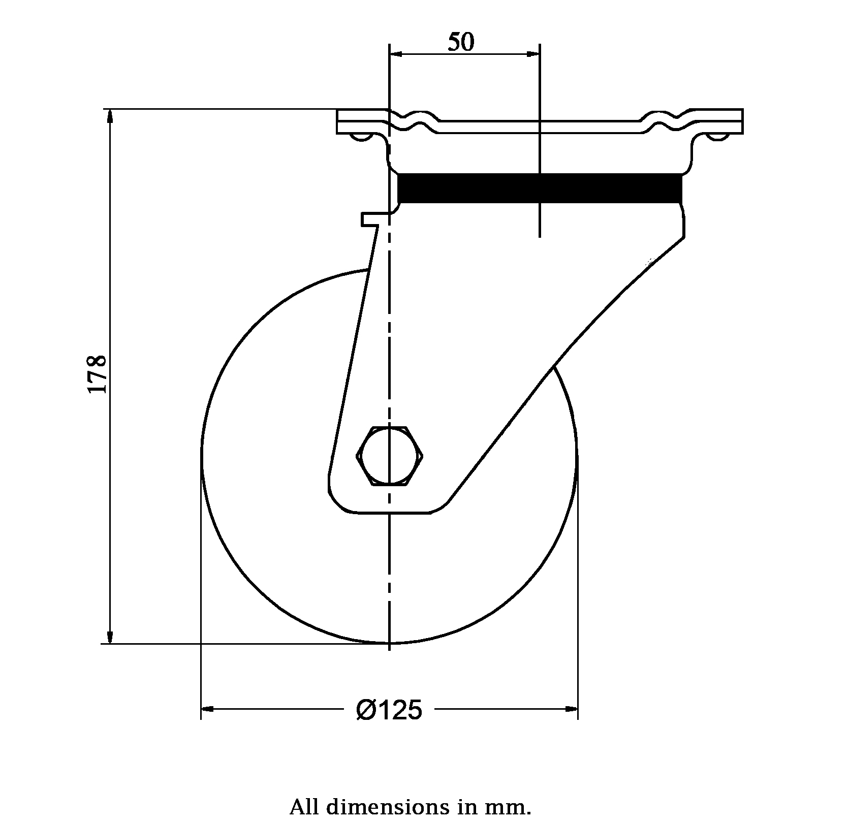 - Swivel castor with strong top plate bracket made of zinc plated steel with sealed hardened double row ball race in swivel head, grease nipple and dust protection ring.
