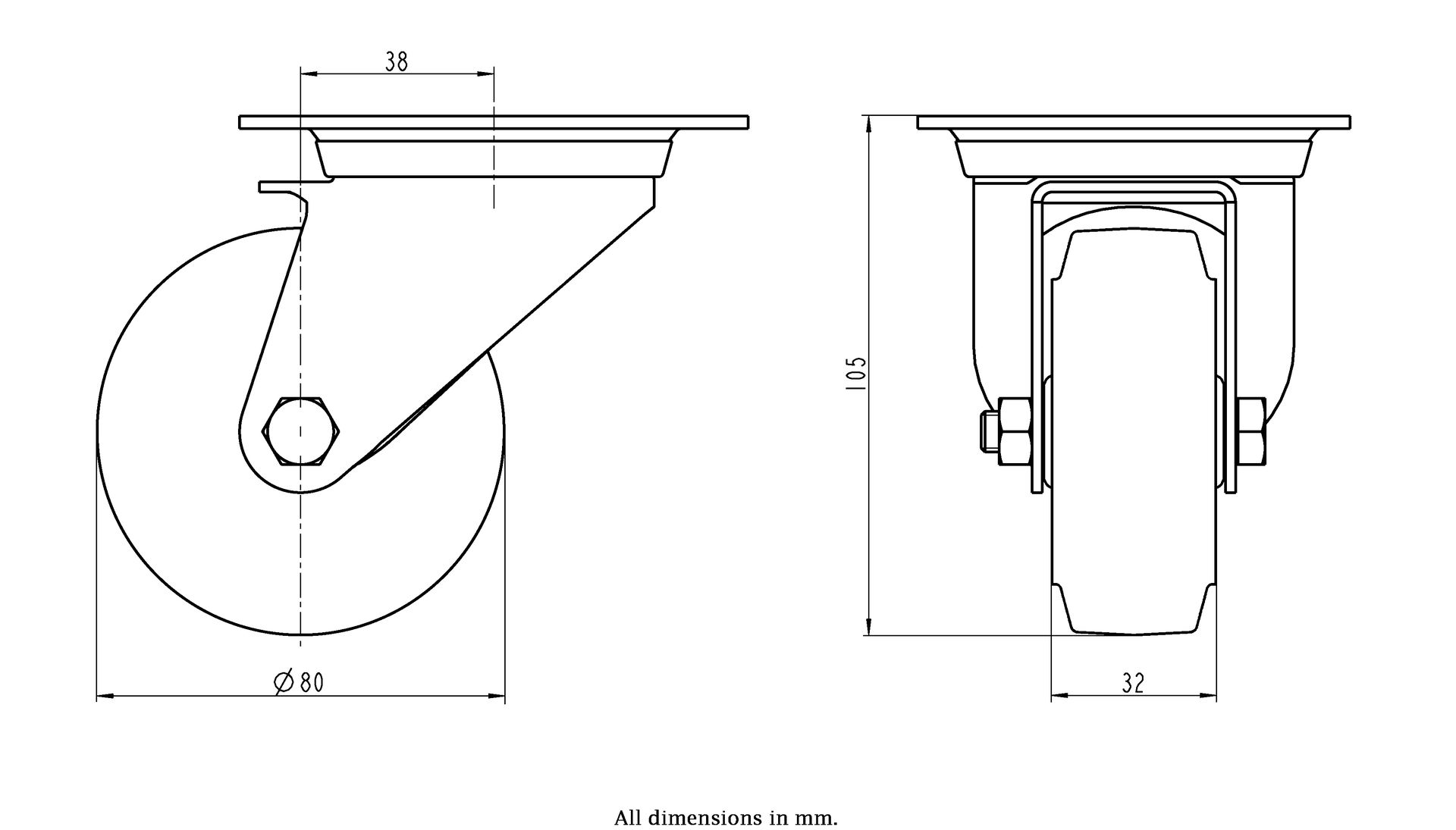 Swivel castor with top plate bracket made of stainless steel with double row ball race in swivel head (material no. 1.4301/AISI 304), with dust protection ring.