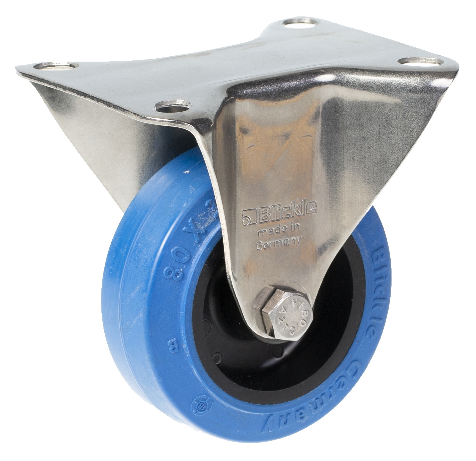80mm stainless steel fixed castor with blue elastic rubber on nylon centre wheel