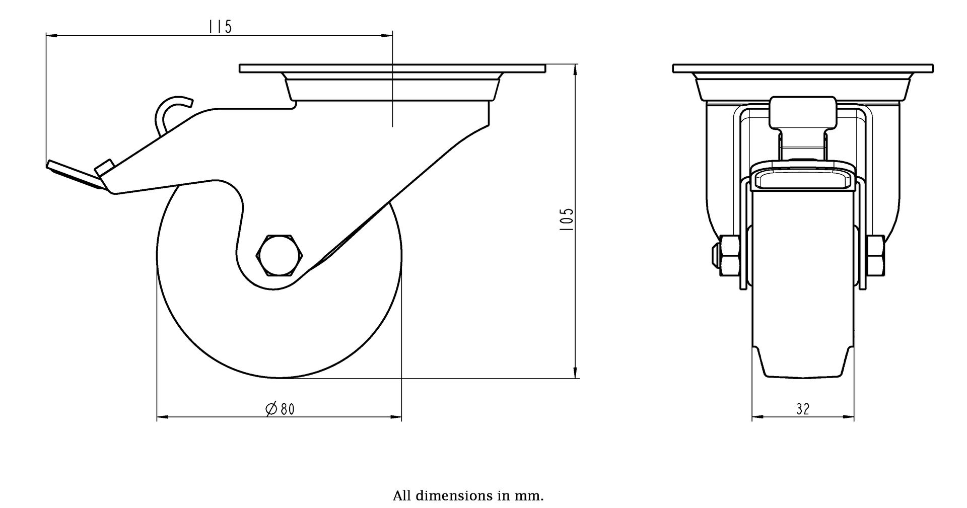 Foot operated brake that locks both swivel and wheel simultaneously.
