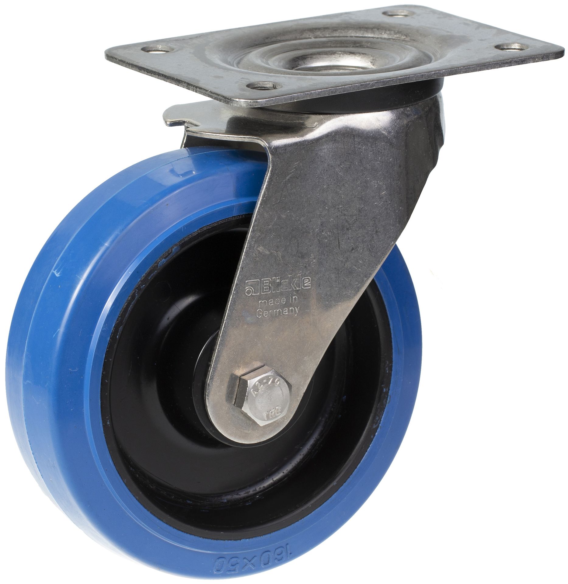 160mm stainless steel swivel castor with blue elastic rubber on nylon centre wheel