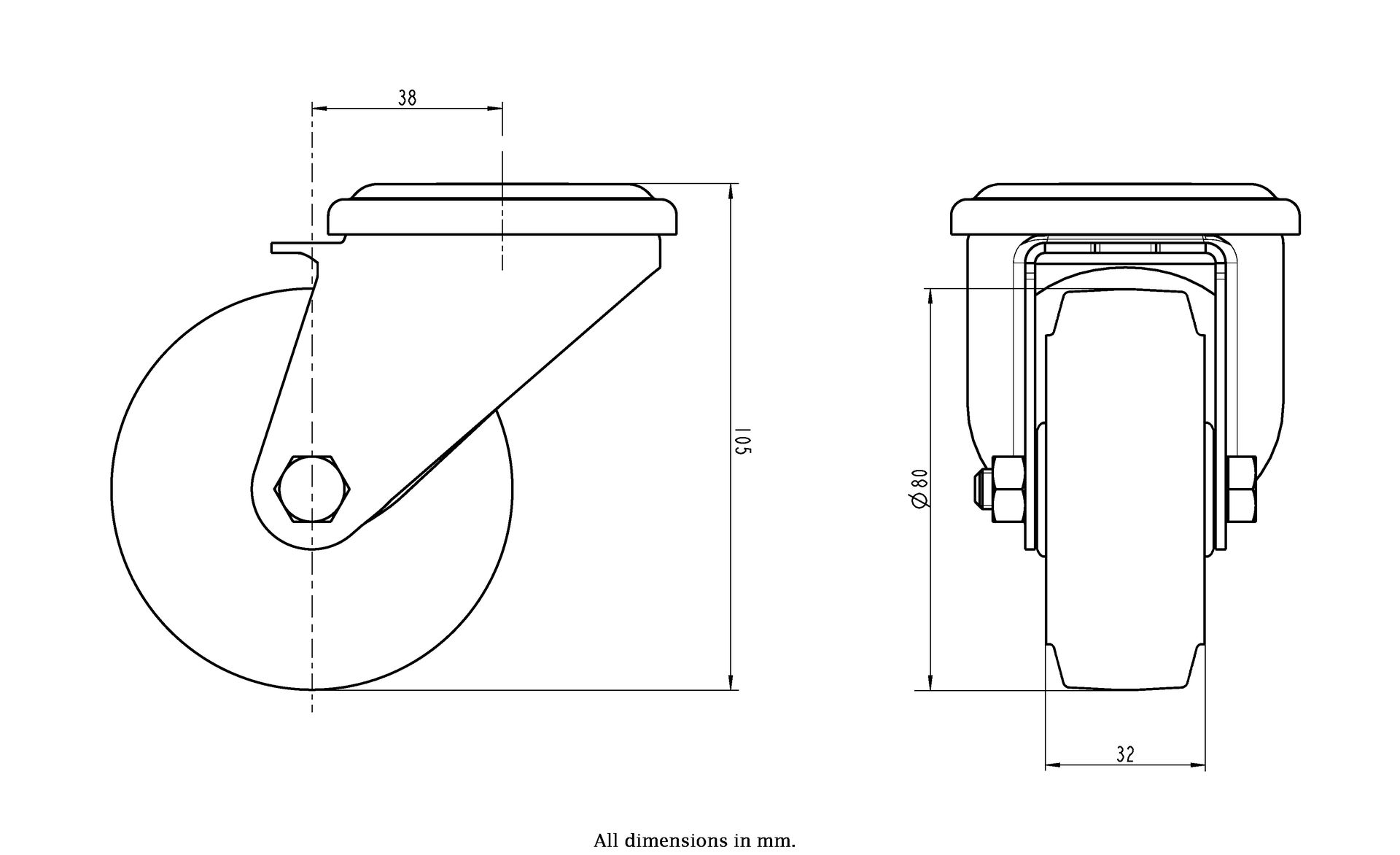 Swivel castor with bolt hole bracket made of stainless steel with double row ball race in swivel head (material no. 1.4301/AISI 304).