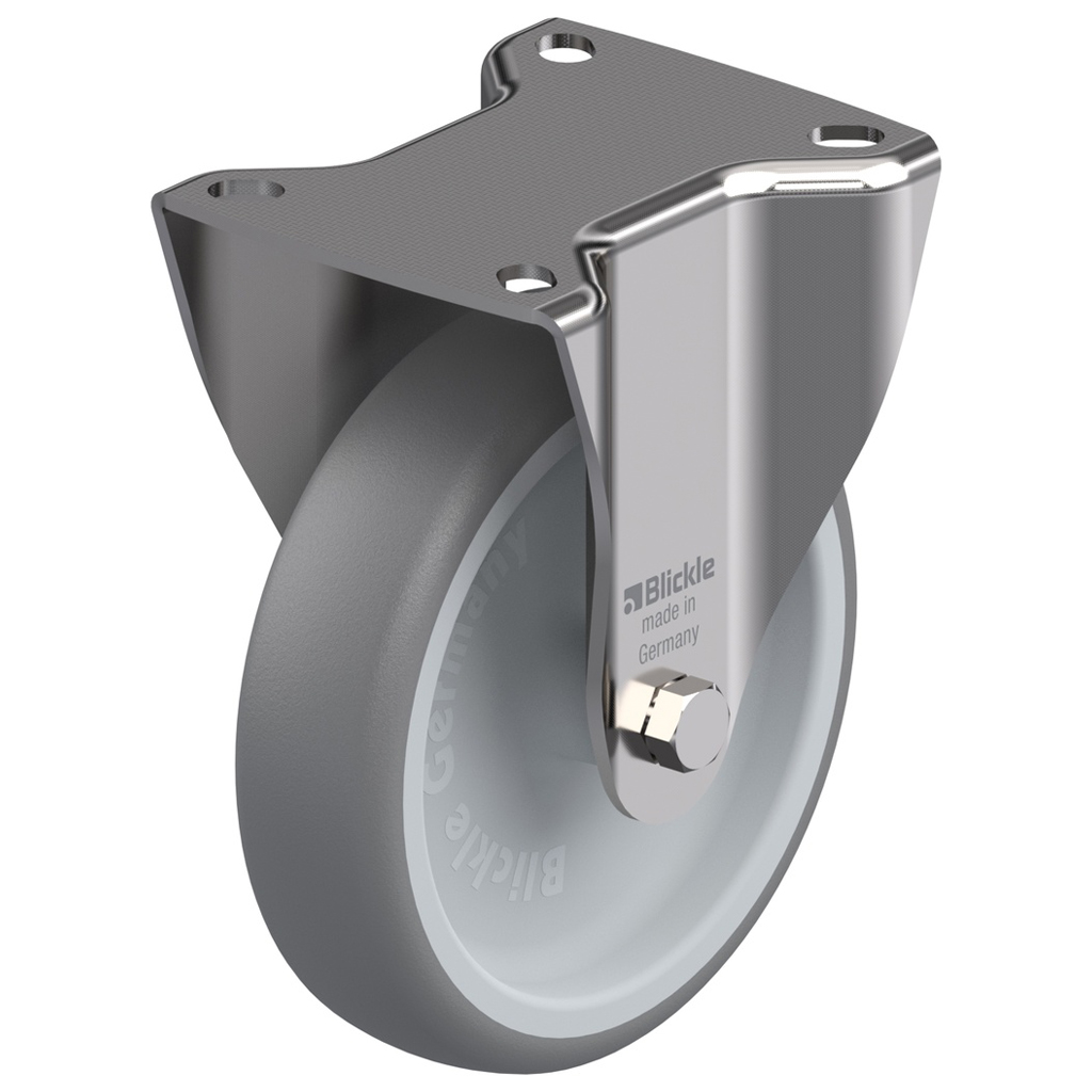 Fixed castor with top plate bracket made of stainless steel (material no. 1.4301/AISI 304).