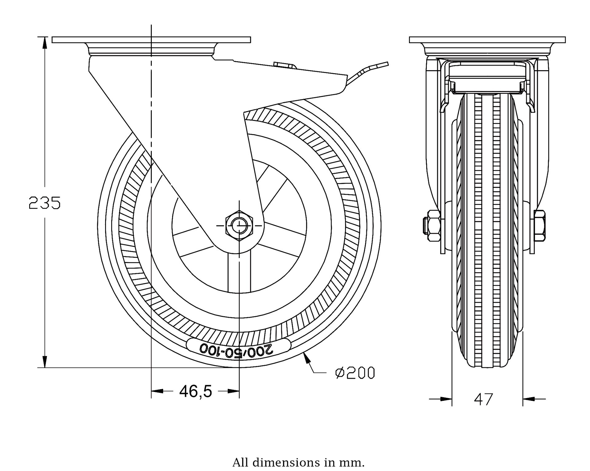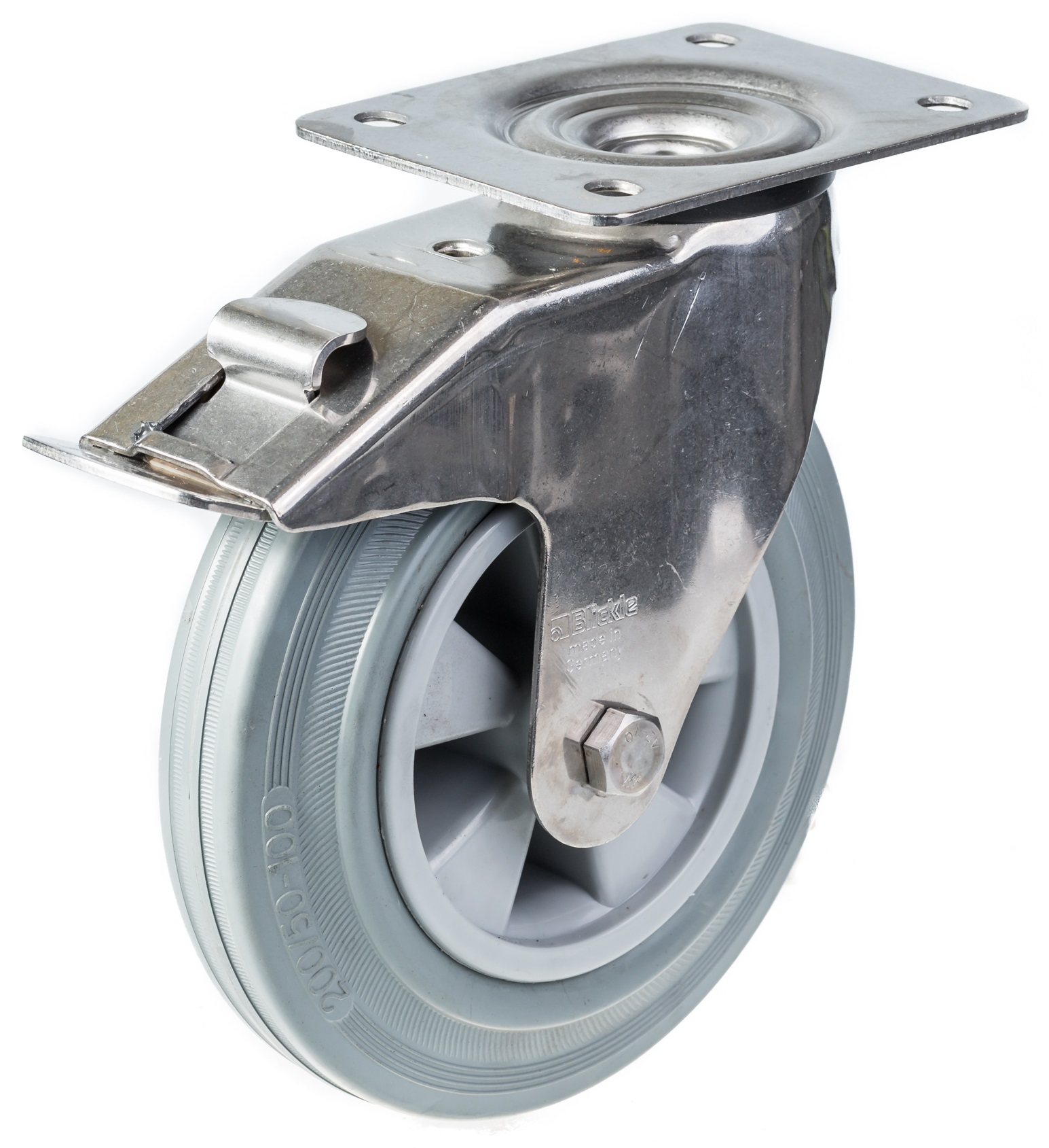 200mm stainless steel swivel/brake castor with grey rubber on polypropylene centre wheel