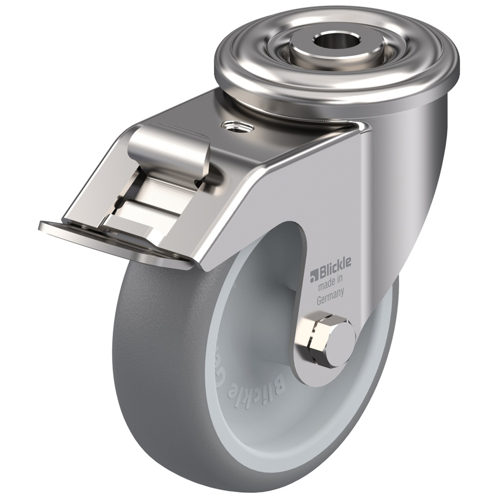 Swivel/brake castor with bolt hole bracket made of stainless steel with double row ball race in swivel head (material no. 1.4301/AISI 304), with dust protection ring.