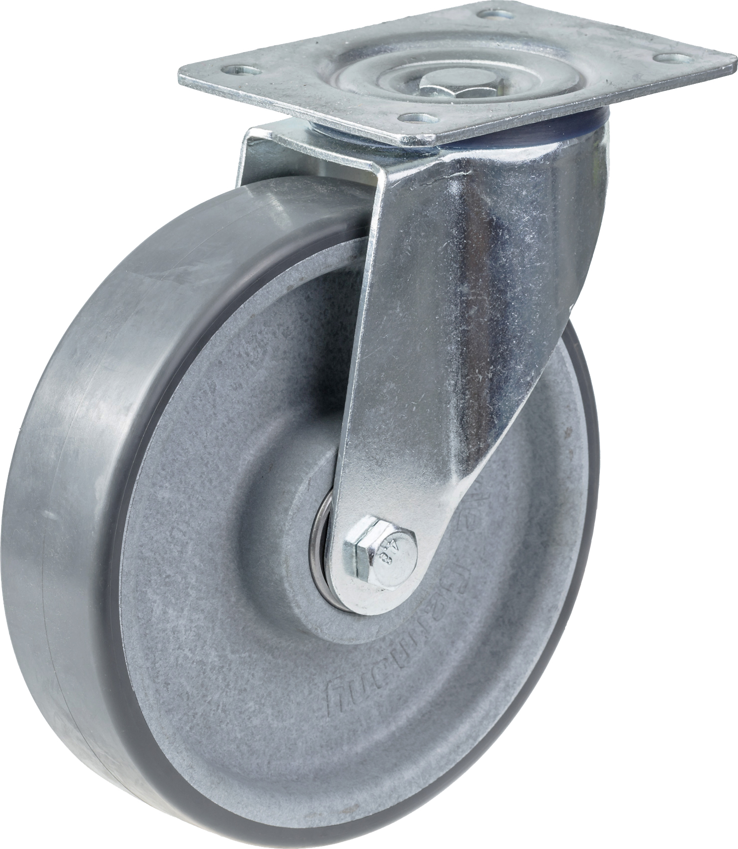 Swivel castor with top plate bracket made of zinc plated steel with double row ball race in swivel head and dust protection ring.