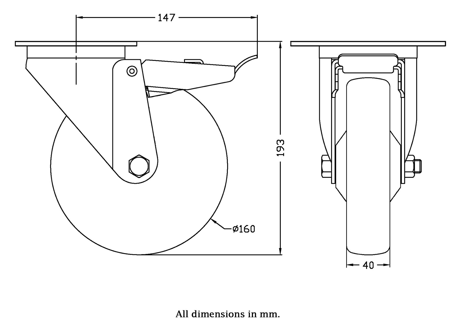 160mm swivel/brake castor with grey electrically conductive thermoplastic polyurethane on nylon centre wheel