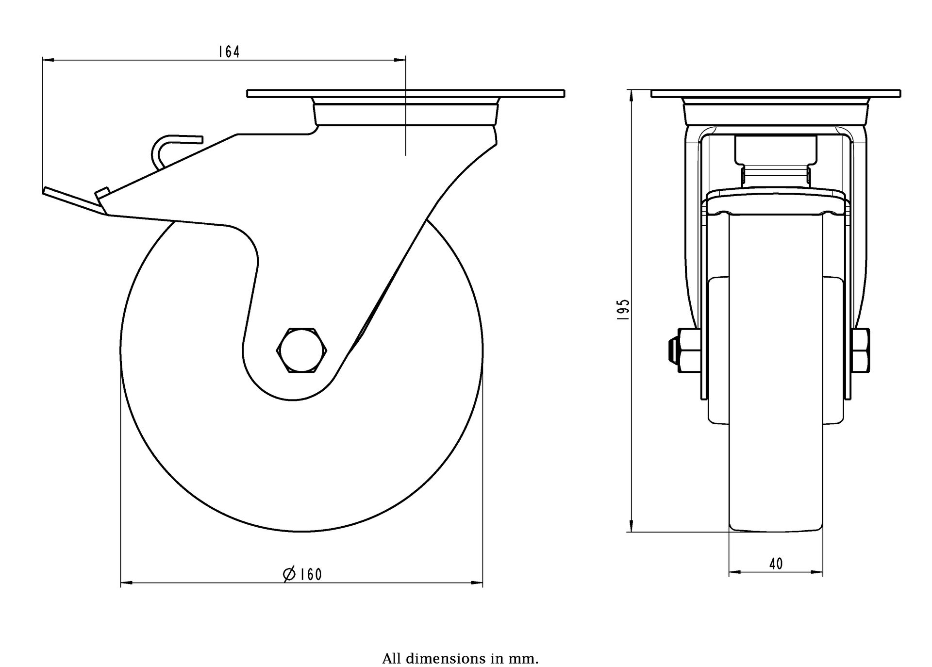 160mm stainless steel swivel/brake castor with grey thermoplastic polyurethane on polypropylene centre wheel