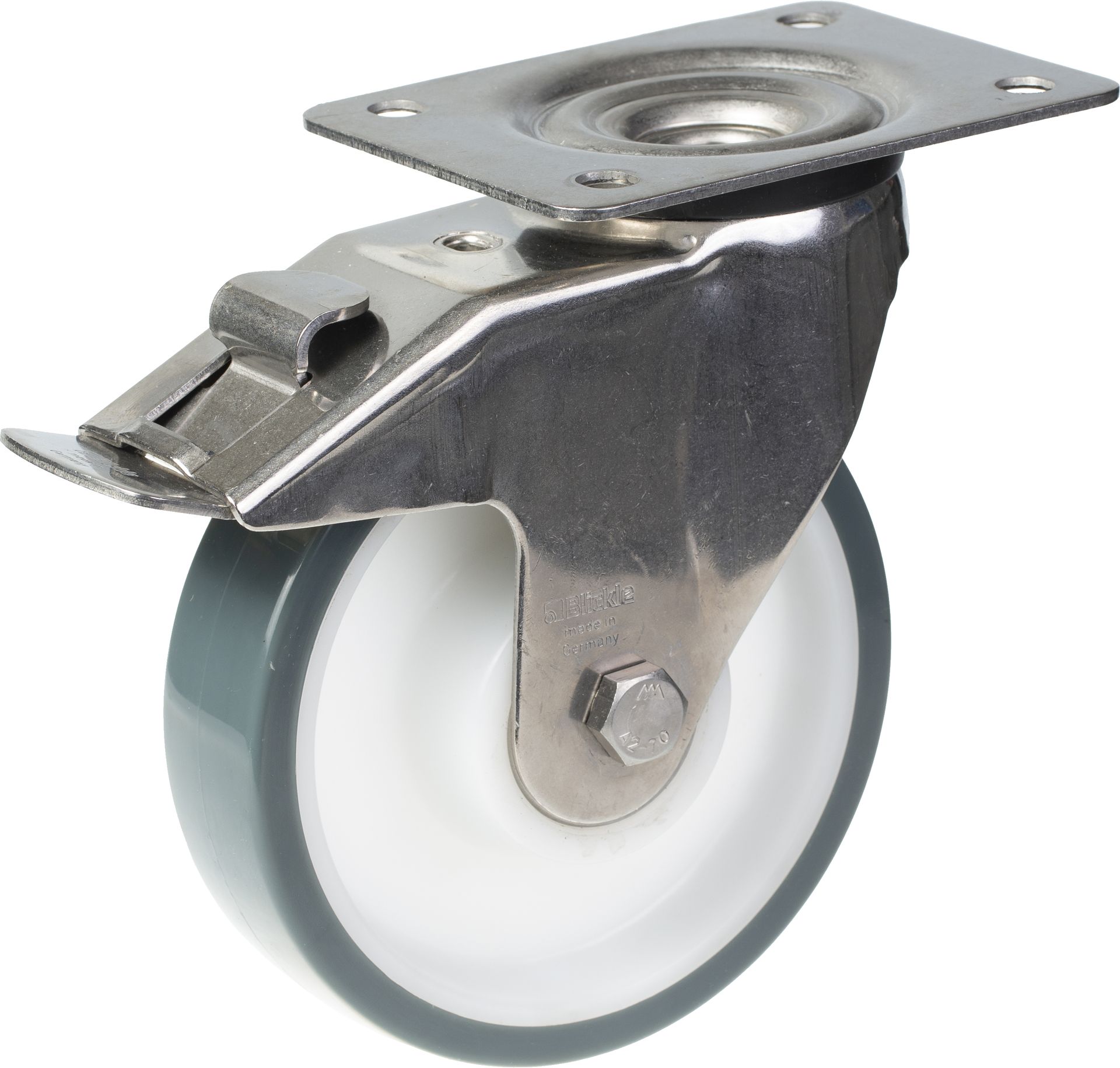 Swivel/brake castor with top plate bracket made of stainless steel with double row ball race in swivel head (material no. 1.4301/AISI 304), with dust protection ring.