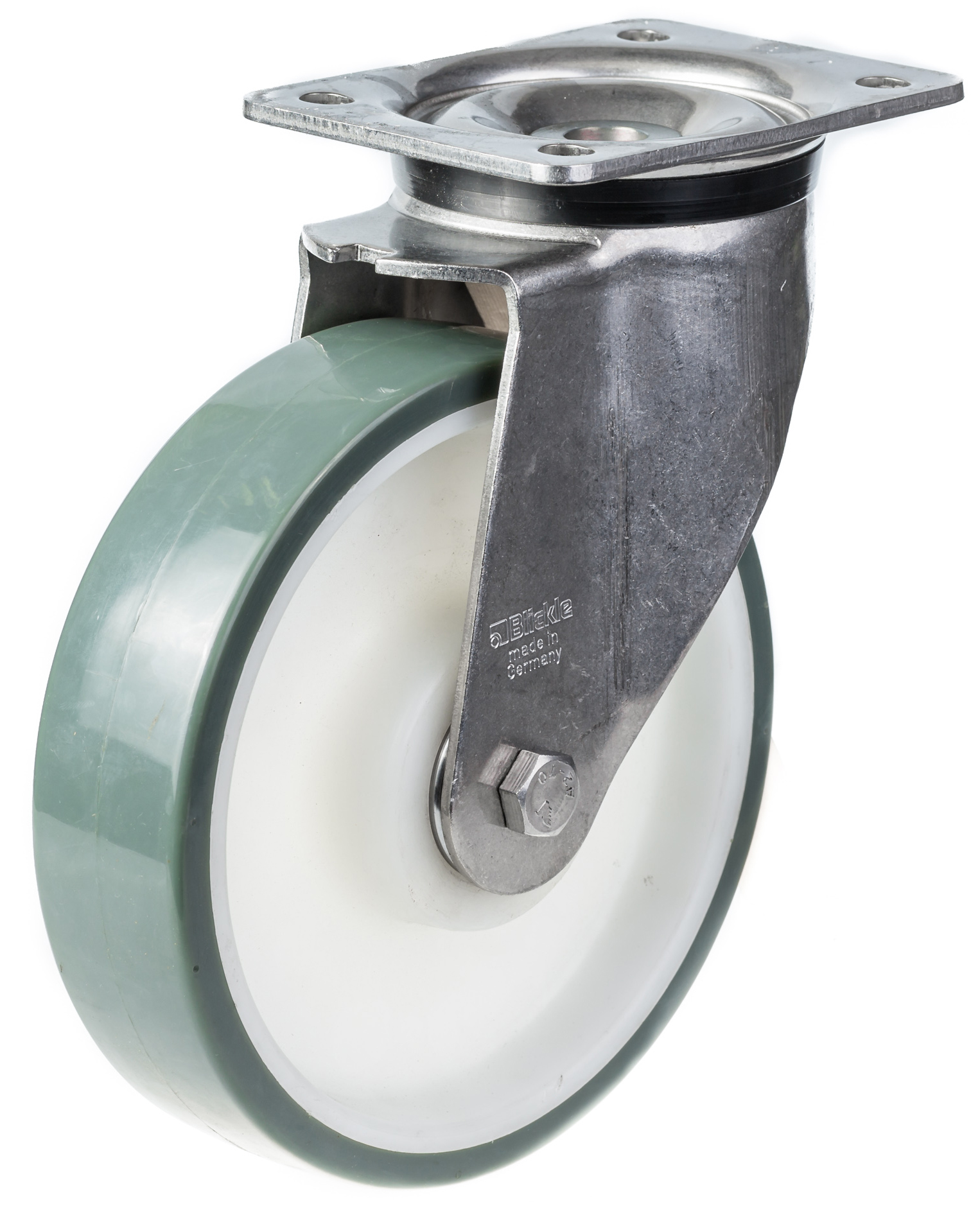 Swivel castor with strong top plate bracket made of stainless steel with double row ball race in swivel head (material no. 1.4301/AISI 304), with dust protection ring.