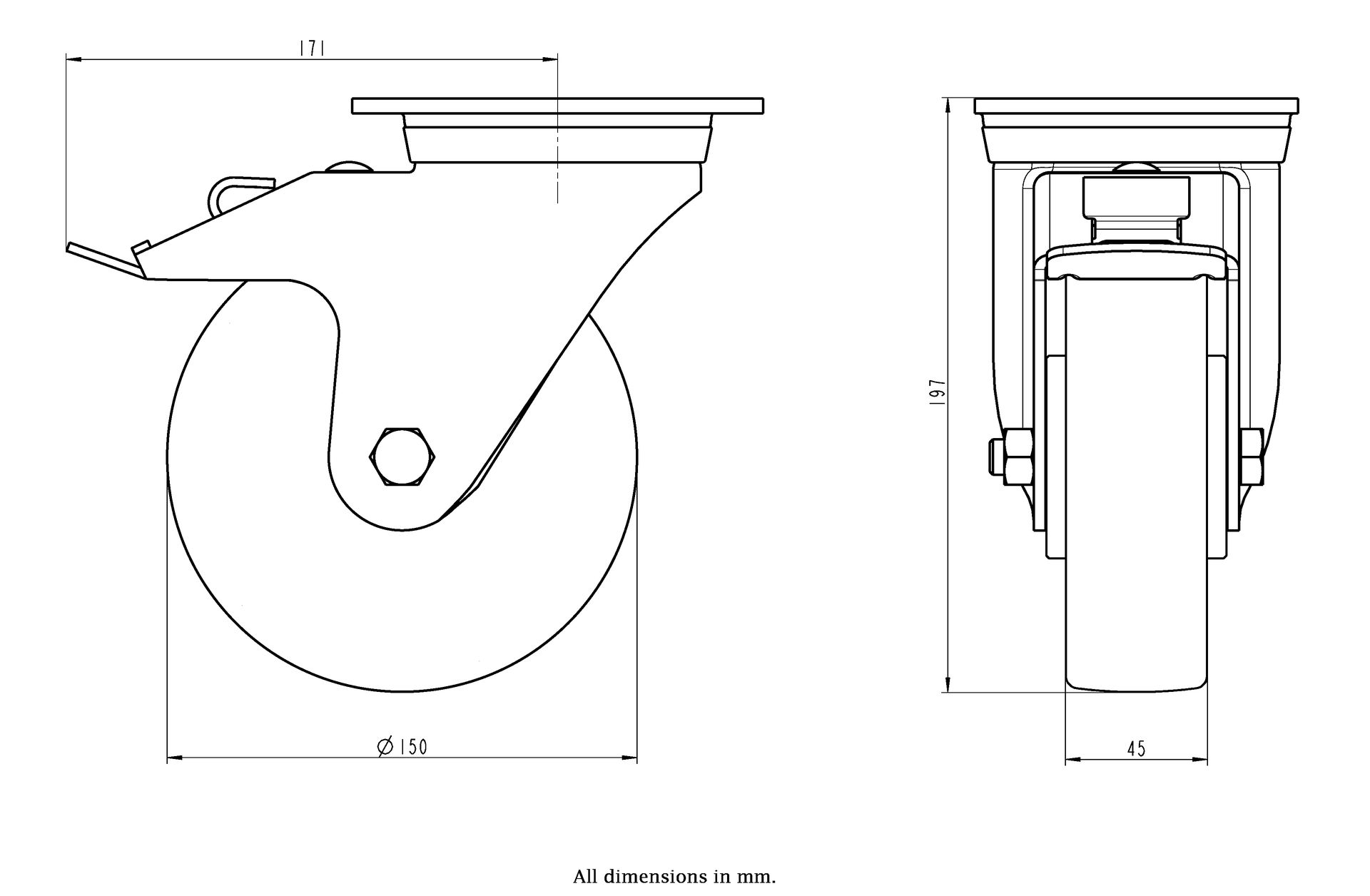 Foot operated brake that locks both swivel and wheel simultaneously.