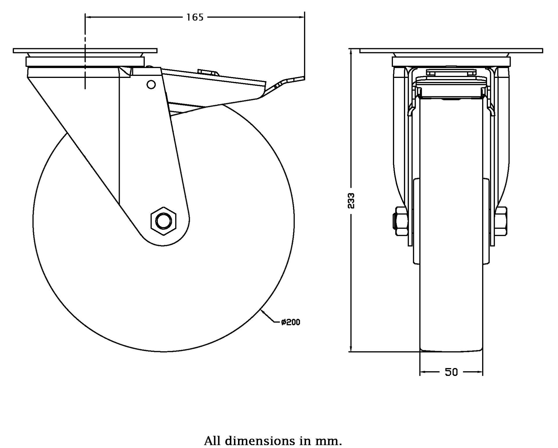 200mm swivel/brake castor with POTH grey electrically conductive thermoplastic polyurethane on nylon centre wheel
