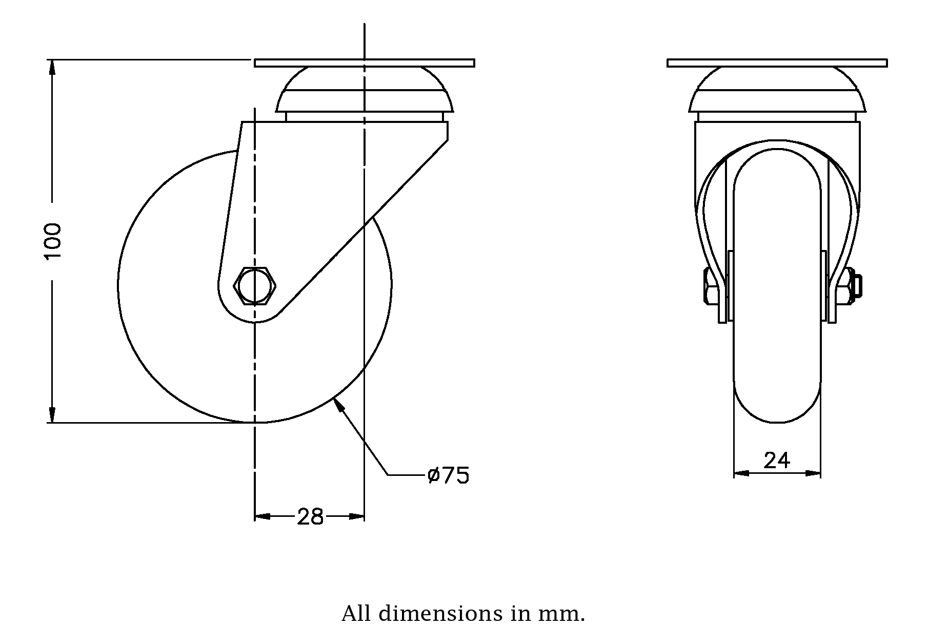 - Swivel castor with top plate bracket made of zinc plated steel with double row ball race in swivel head.