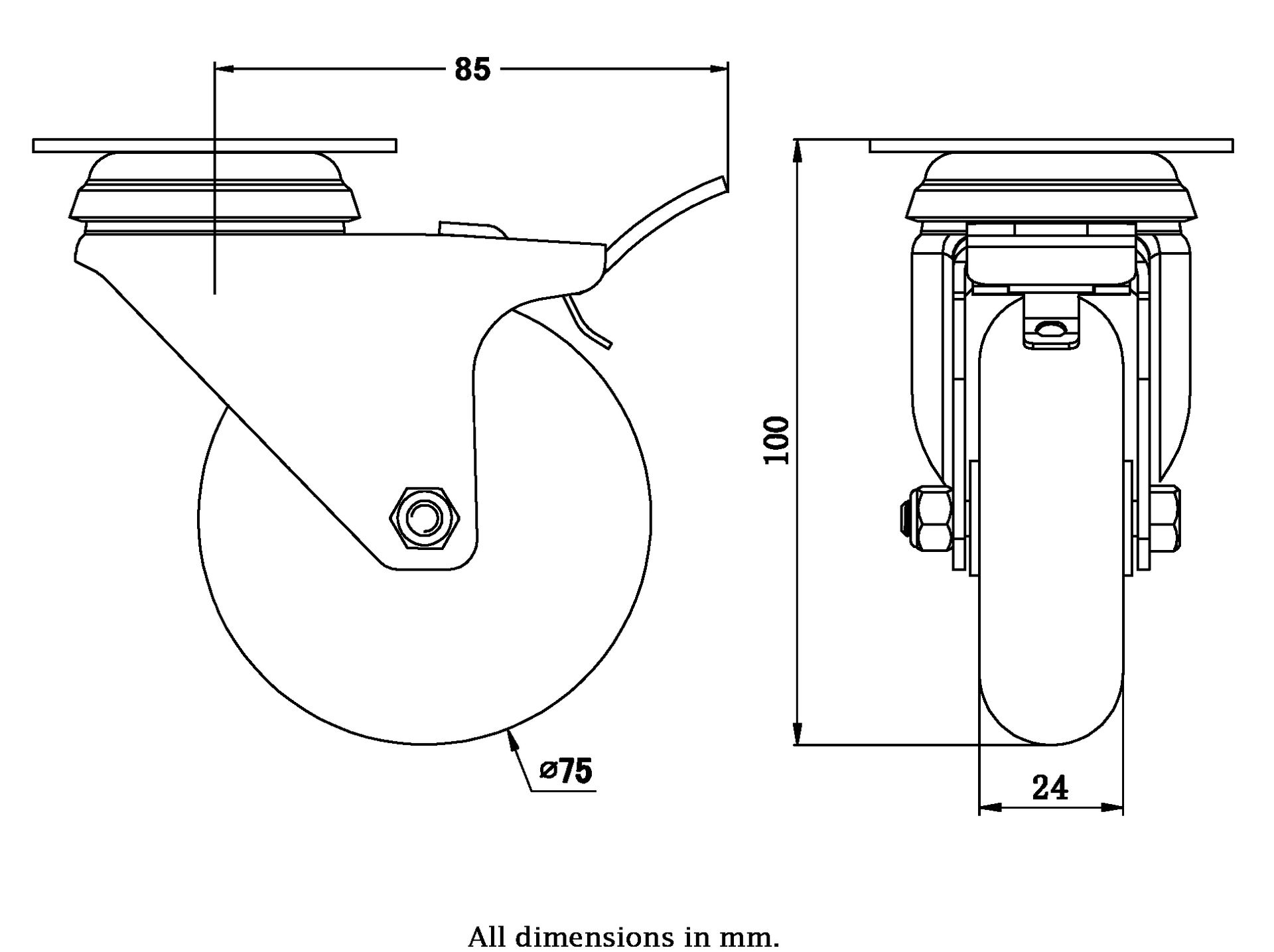 - Swivel/brake castor with top plate bracket made of zinc plated steel with double row ball race in swivel head.