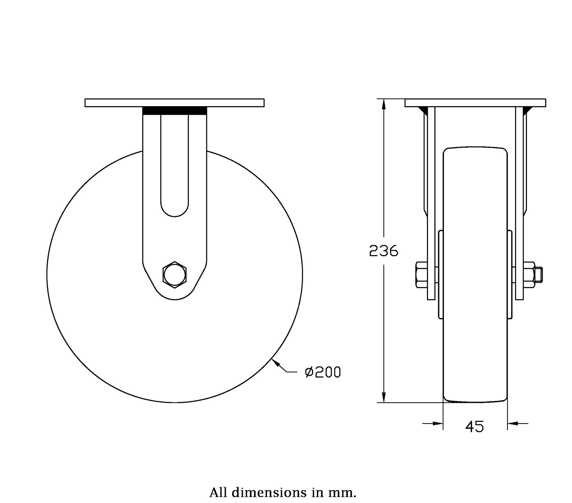 Fixed castor with strong top plate bracket made of zinc plated steel.