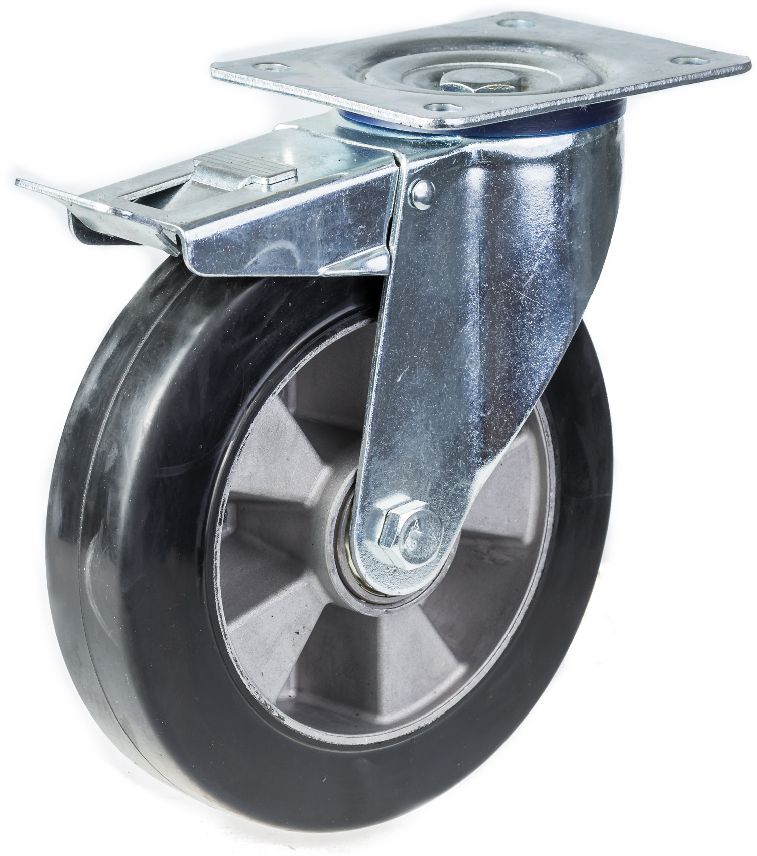 200mm swivel/brake castor with black elastic rubber on aluminium centre wheel