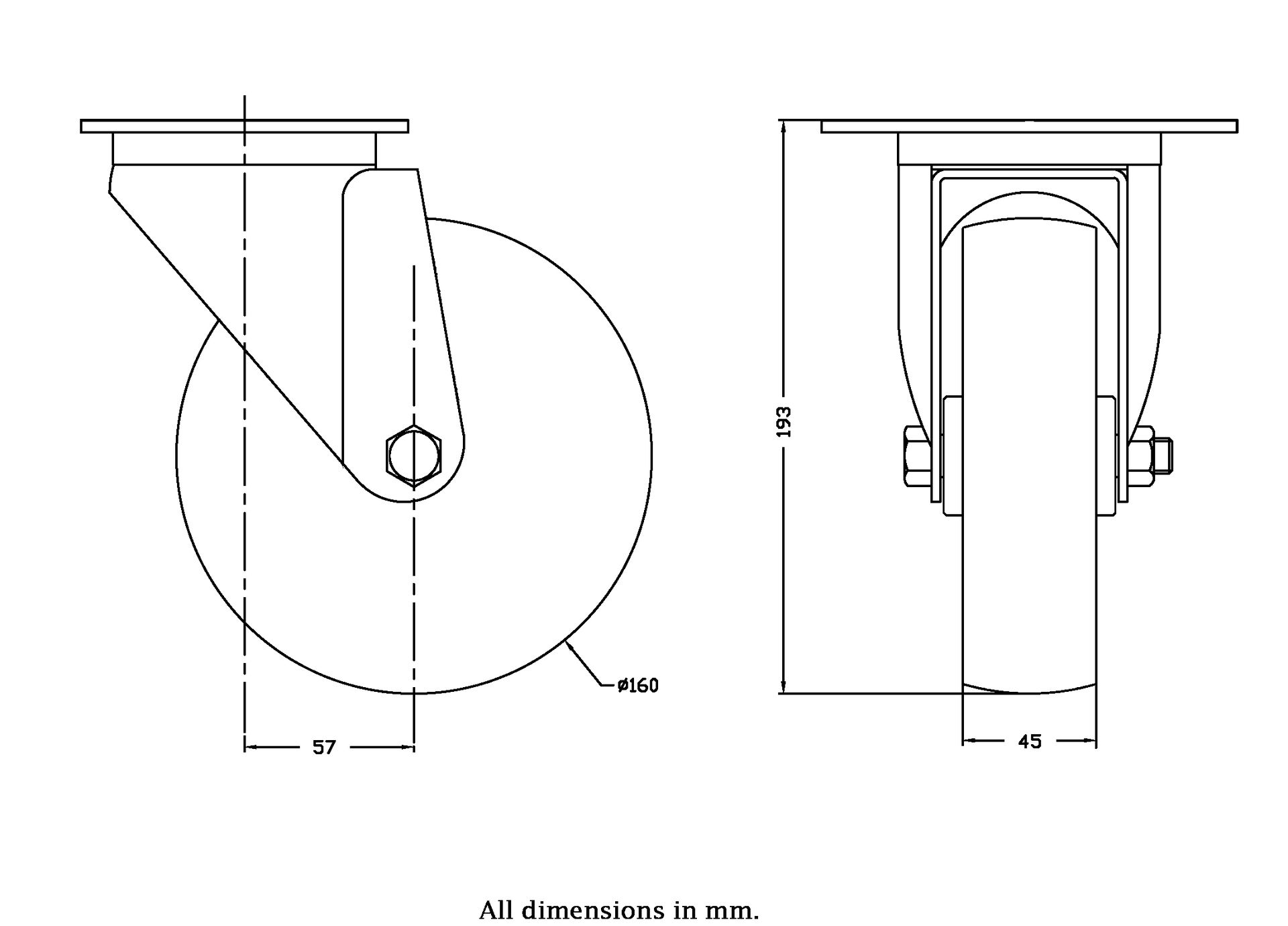 Swivel castor with top plate bracket made of zinc plated steel with double row ball race in swivel head and dust protection ring.