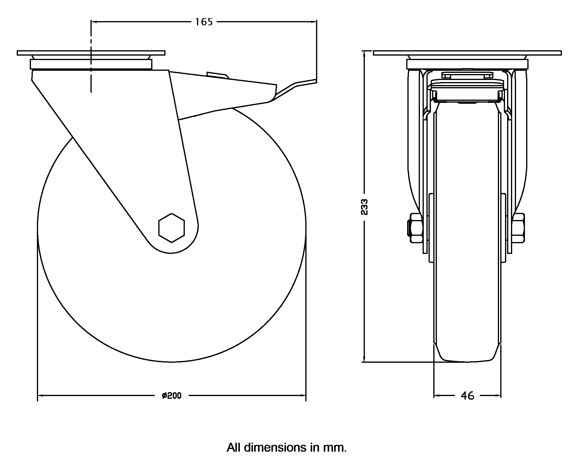 - Swivel/brake castor with top plate bracket made of zinc plated steel with double row ball race in swivel head and dust protection ring.