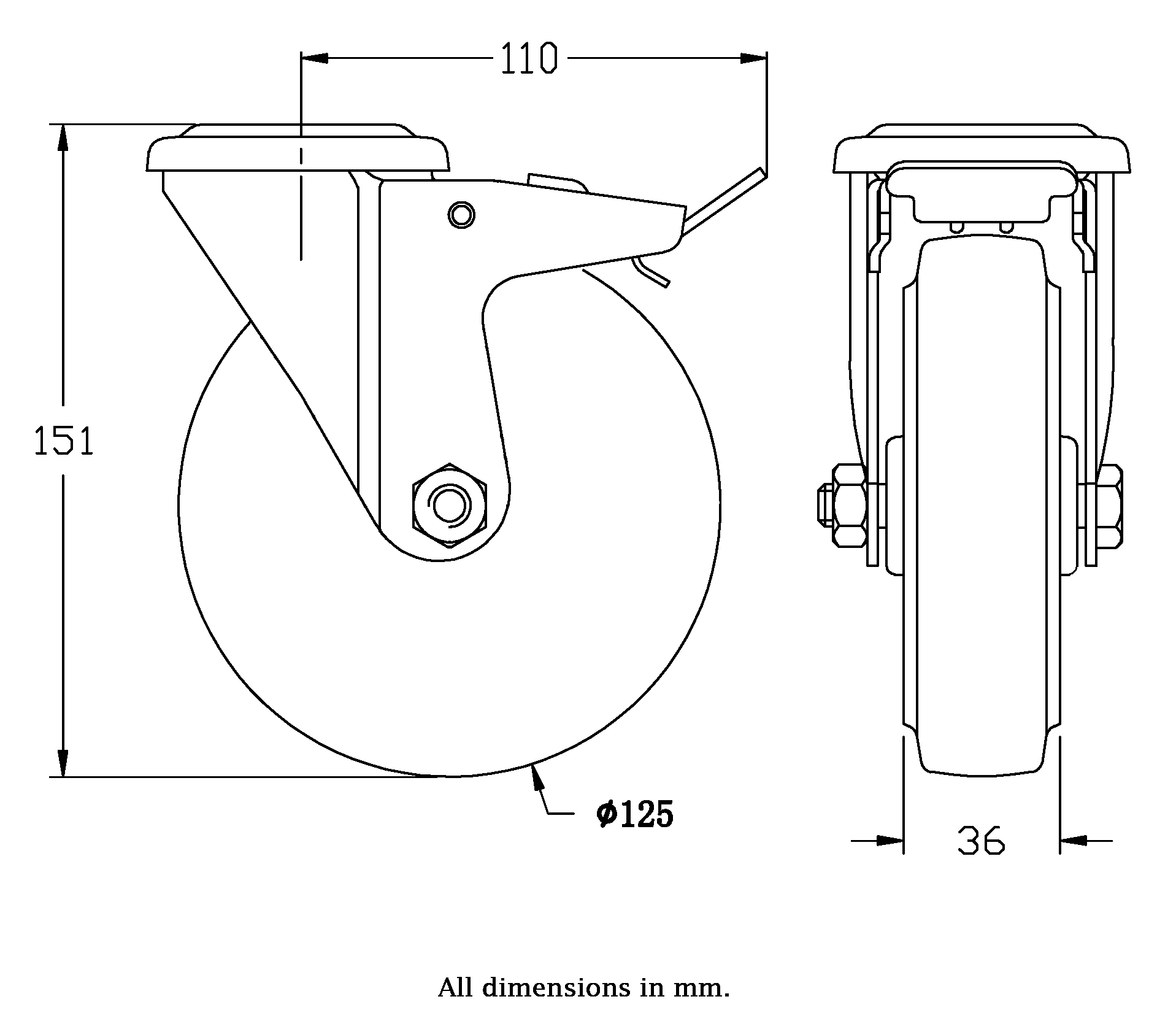 - Swivel/brake castor with bolt hole bracket made of zinc plated steel with double row ball race in swivel head.