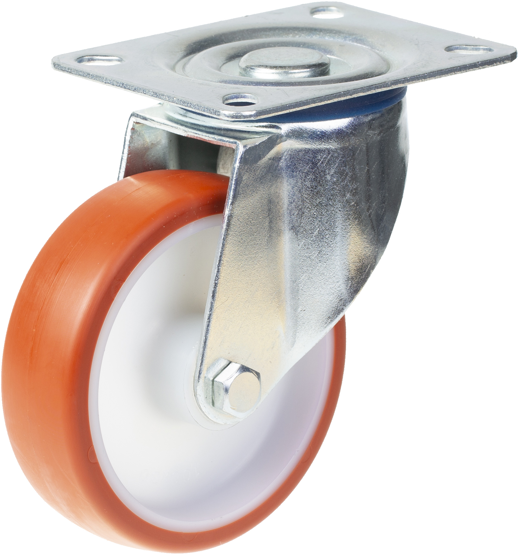 - Swivel castor with top plate bracket made of zinc plated steel with double row ball race in swivel head and dust protection ring.