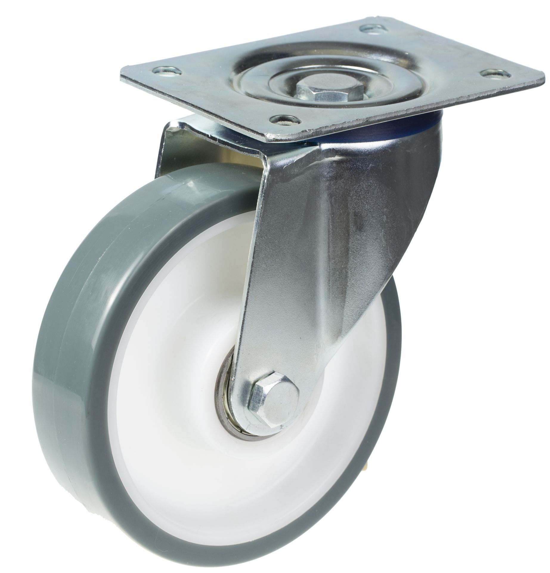 - Swivel castor with top plate bracket made of zinc plated steel with double row ball race in swivel head and dust protection ring.