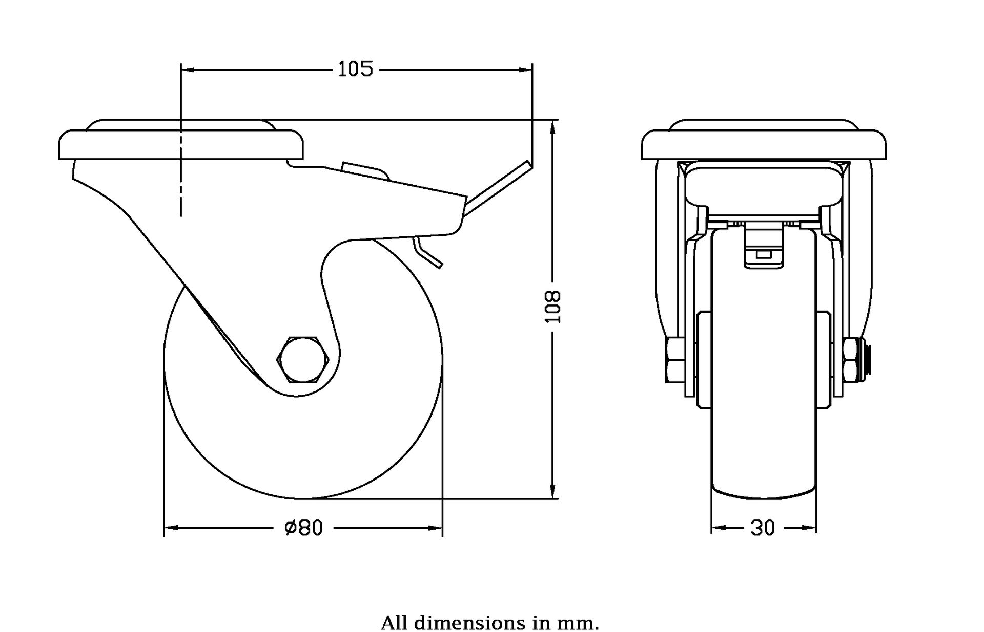 - Swivel/brake castor with bolt hole bracket made of zinc plated steel with double row ball race in swivel head.