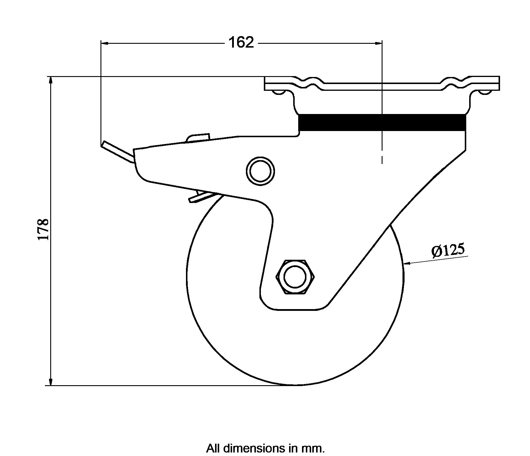 - Swivel/brake castor with strong top plate bracket made of zinc plated steel with sealed hardened double row ball race in swivel head, grease nipple and dust protection ring.