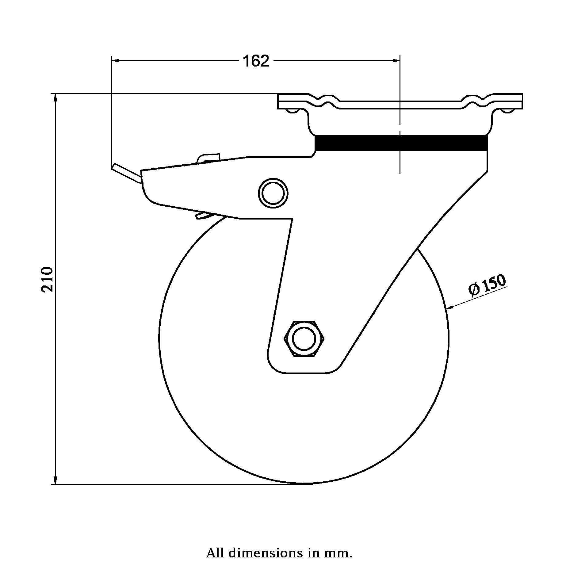 - Swivel/brake castor with strong top plate bracket made of zinc plated steel with sealed hardened double row ball race in swivel head, grease nipple and dust protection ring.