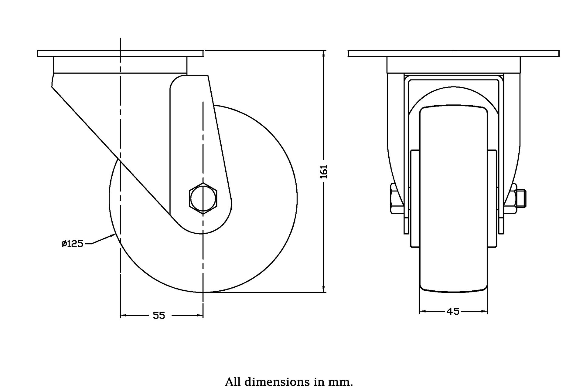 - Swivel castor with top plate bracket made of zinc plated steel with double row ball race in swivel head and dust protection ring.