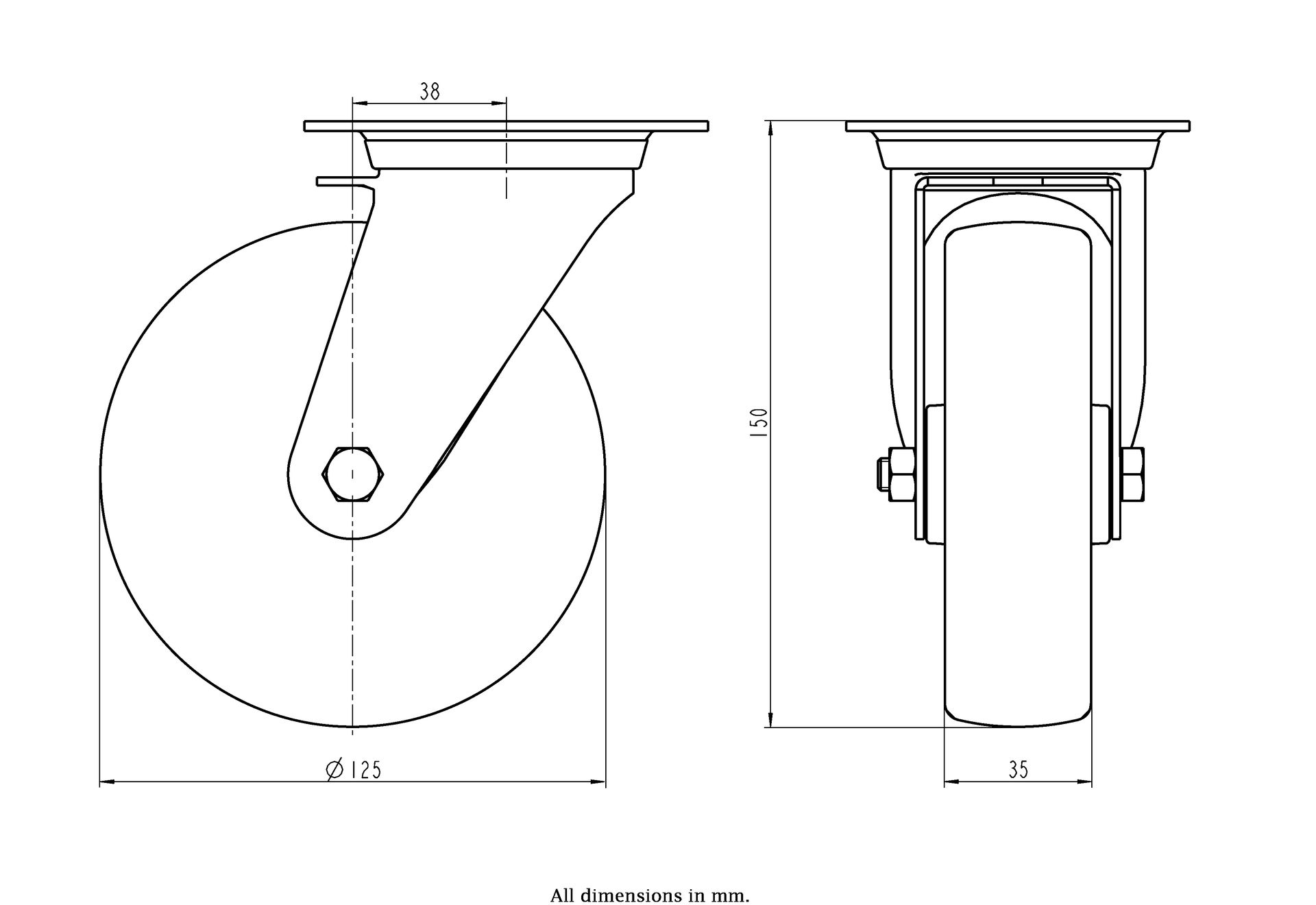 125mm stainless steel swivel castor with red thermoplastic polyurethane on nylon centre wheel