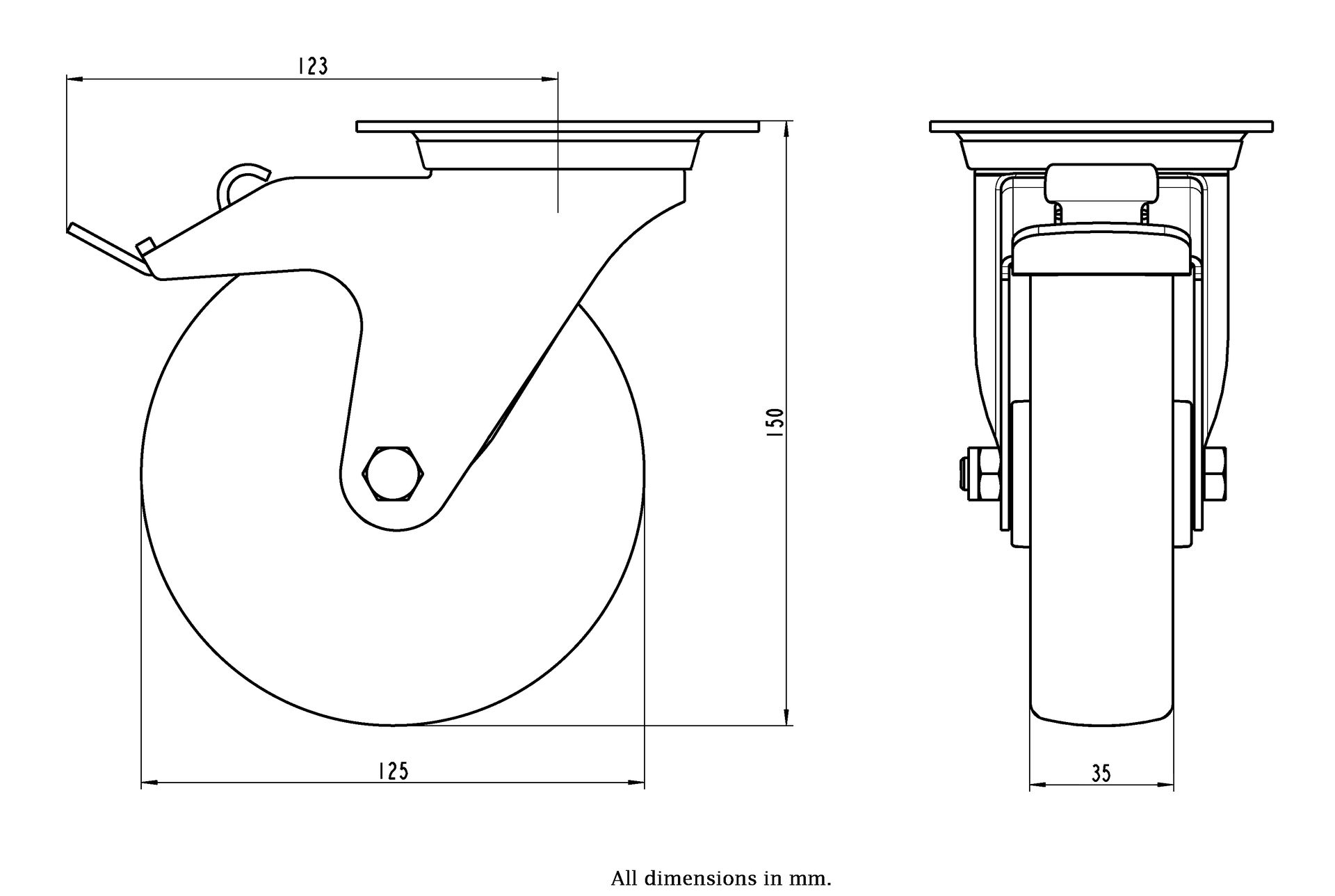 Foot operated brake that locks both swivel and wheel simultaneously.