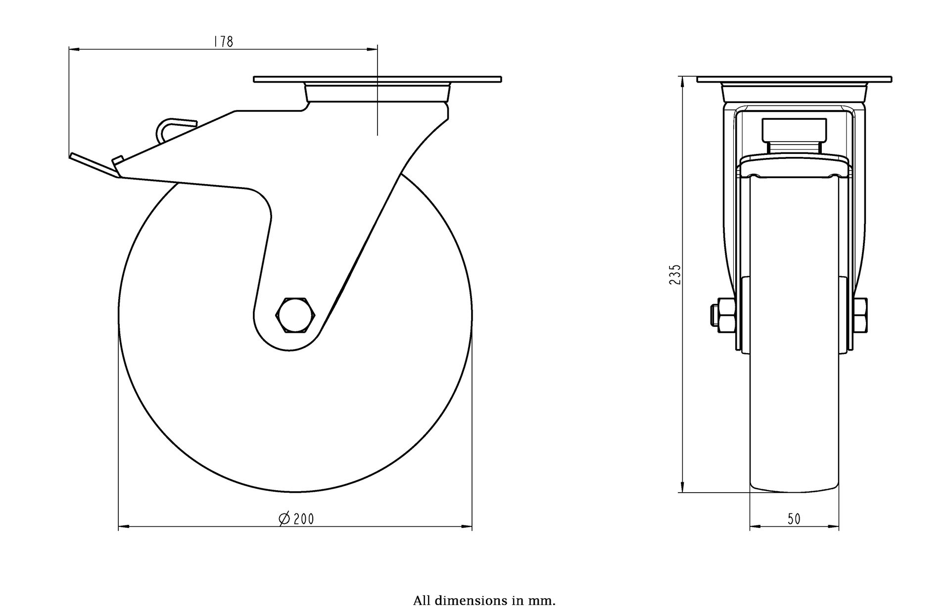 Foot operated brake that locks both swivel and wheel simultaneously.