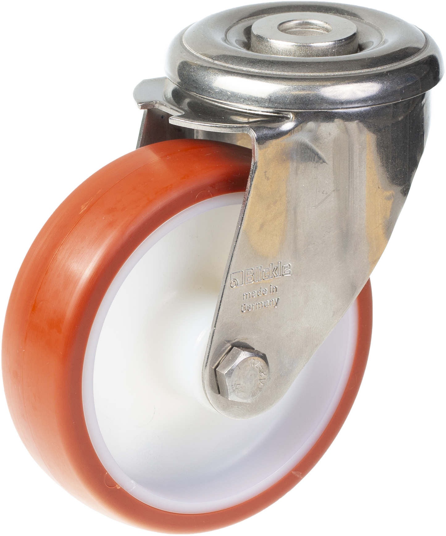 Swivel castor with bolt hole bracket made of stainless steel with double row ball race in swivel head (material no. 1.4301/AISI 304).