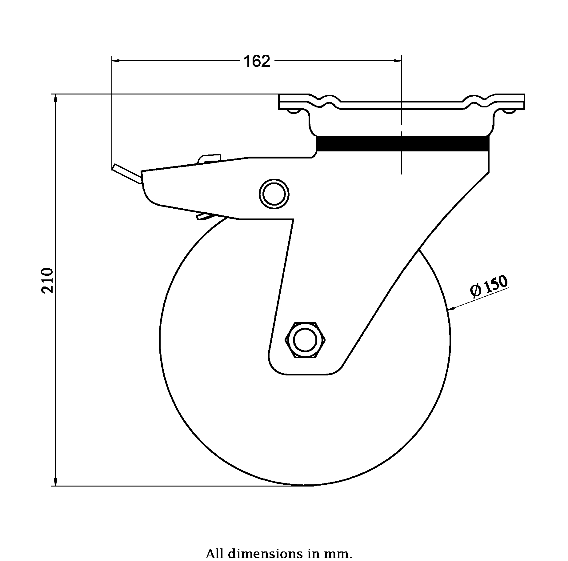 Swivel/brake castor with strong top plate bracket made of zinc plated steel with sealed hardened double row ball race in swivel head, grease nipple and dust protection ring.