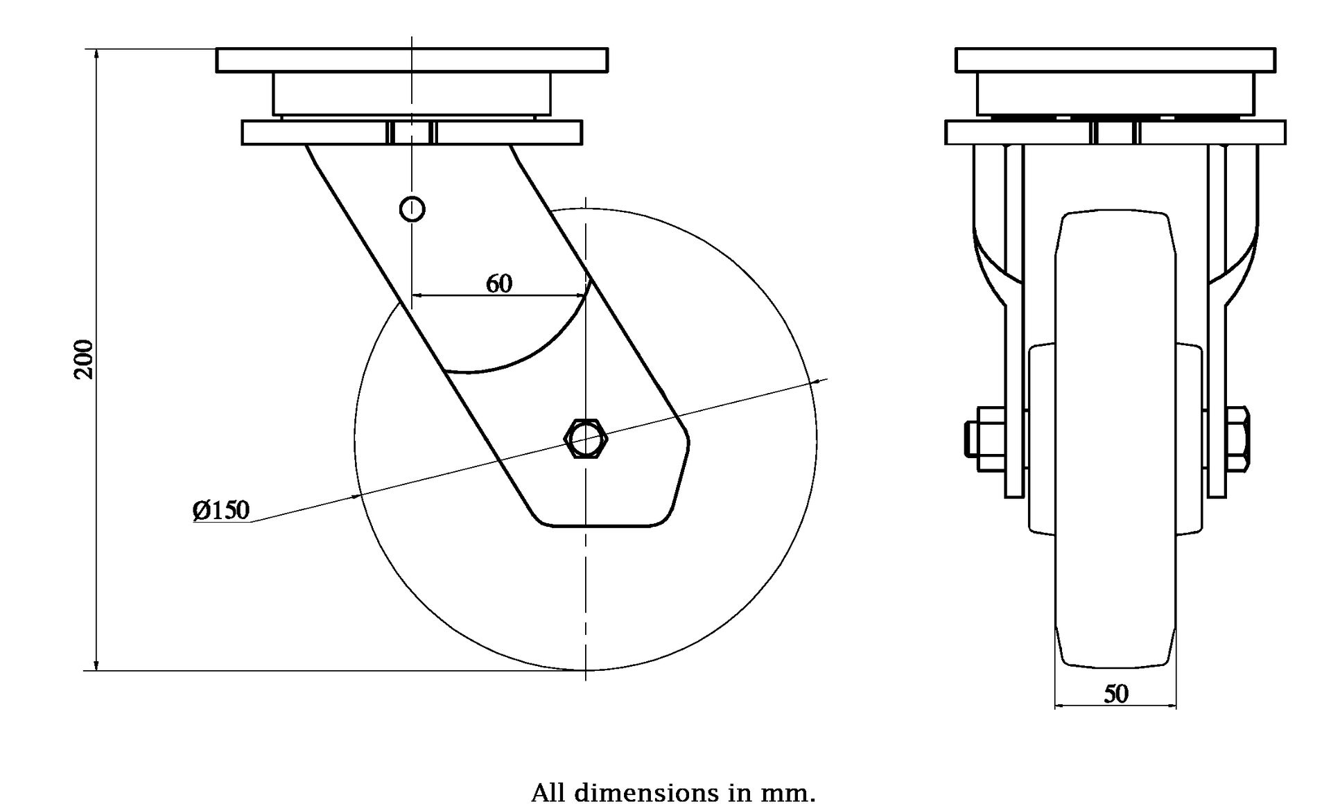 Swivel castor with very strong top plate bracket made of zinc plated steel with a combination of thrust ball bearing and taper roller bearing in swivel head, with dust protection ring.