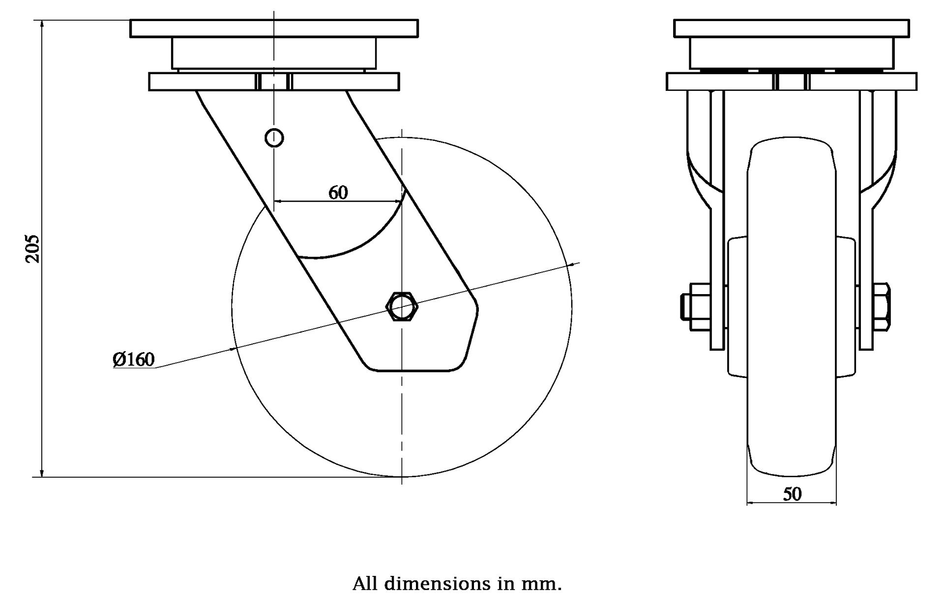Swivel castor with very strong top plate bracket made of zinc plated steel with a combination of thrust ball bearing and taper roller bearing in swivel head, with dust protection ring.