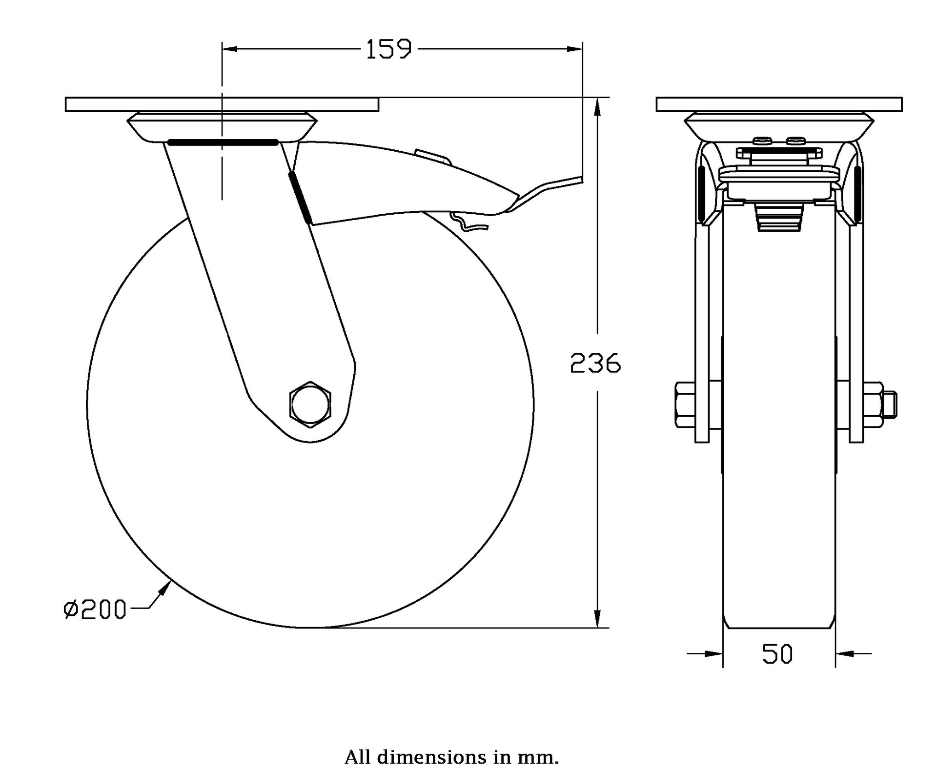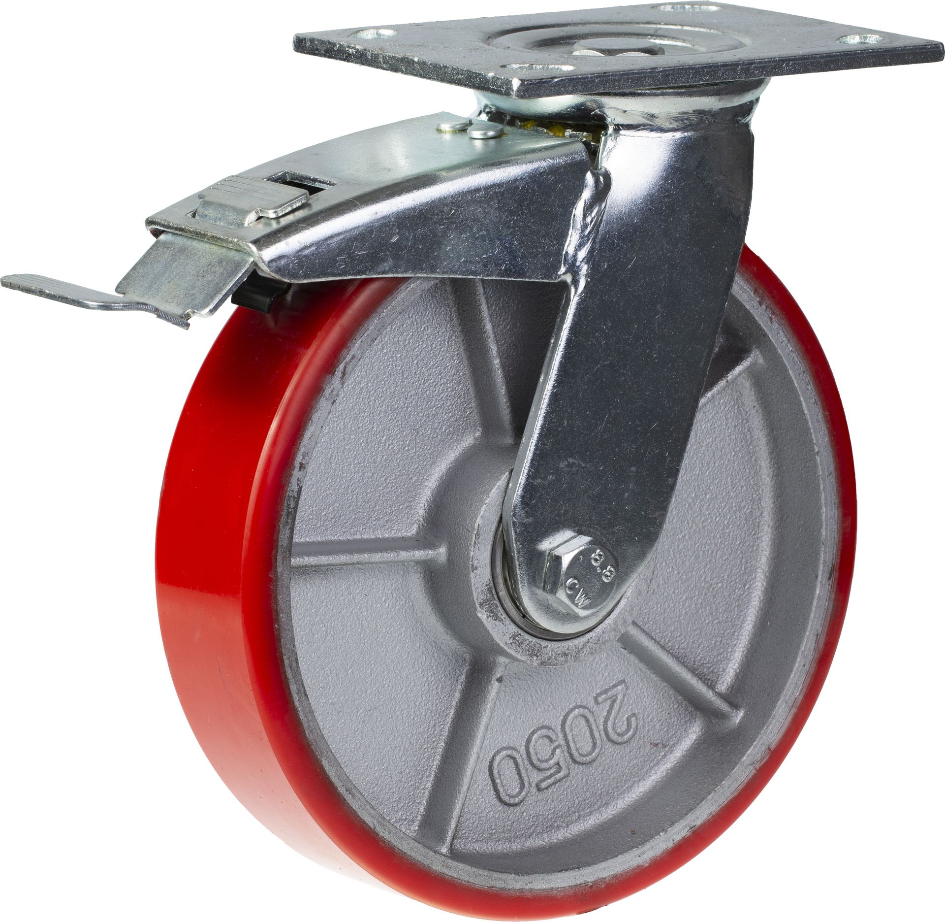 200mm swivel/brake castor with red polyurethane on cast iron centre wheel