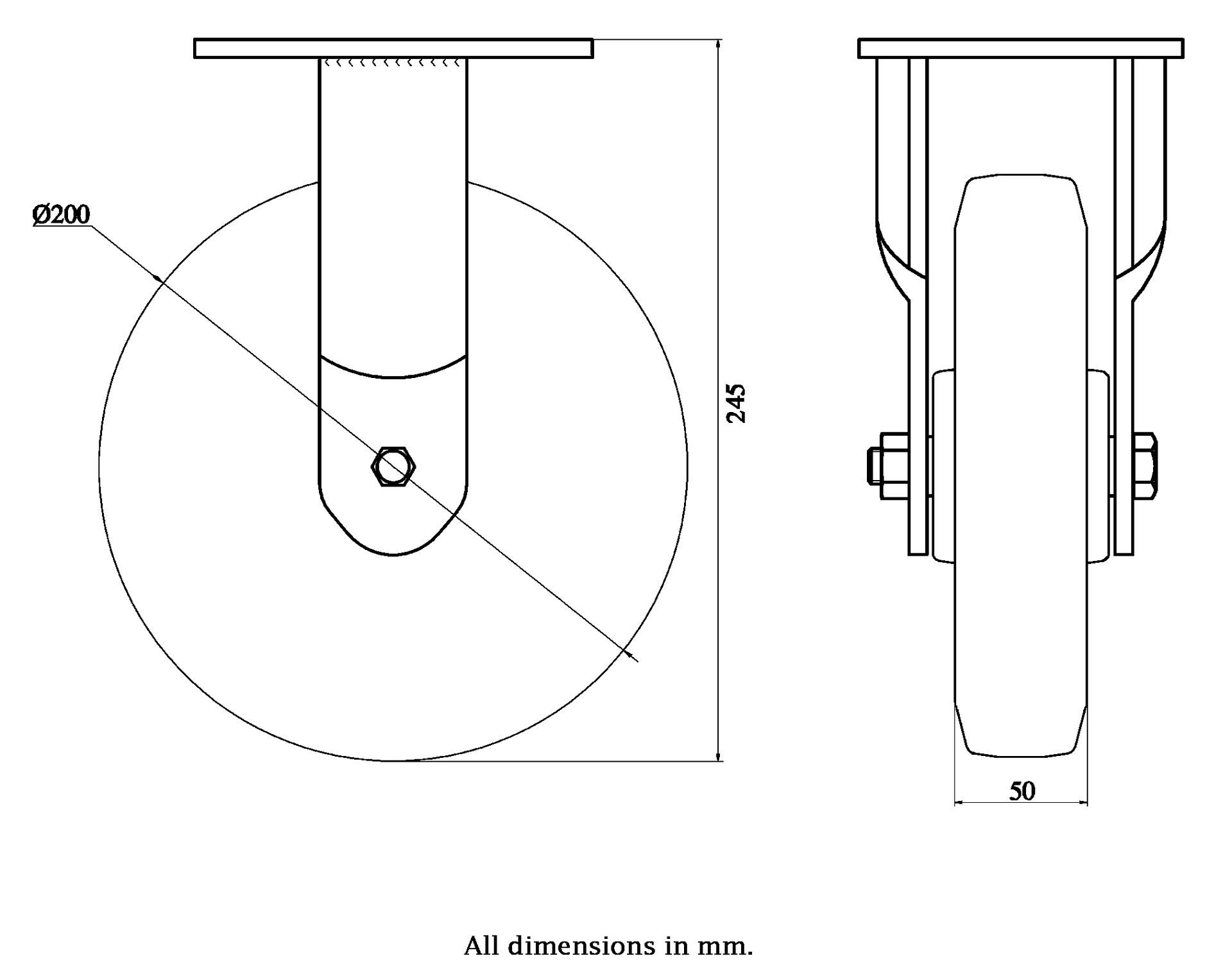 200mm fixed castor with yellow polyurethane on cast iron centre wheel