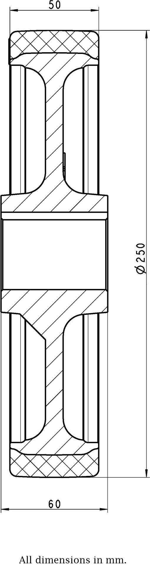 250mm wheel with brown polyurethane on cast iron centre with keyway