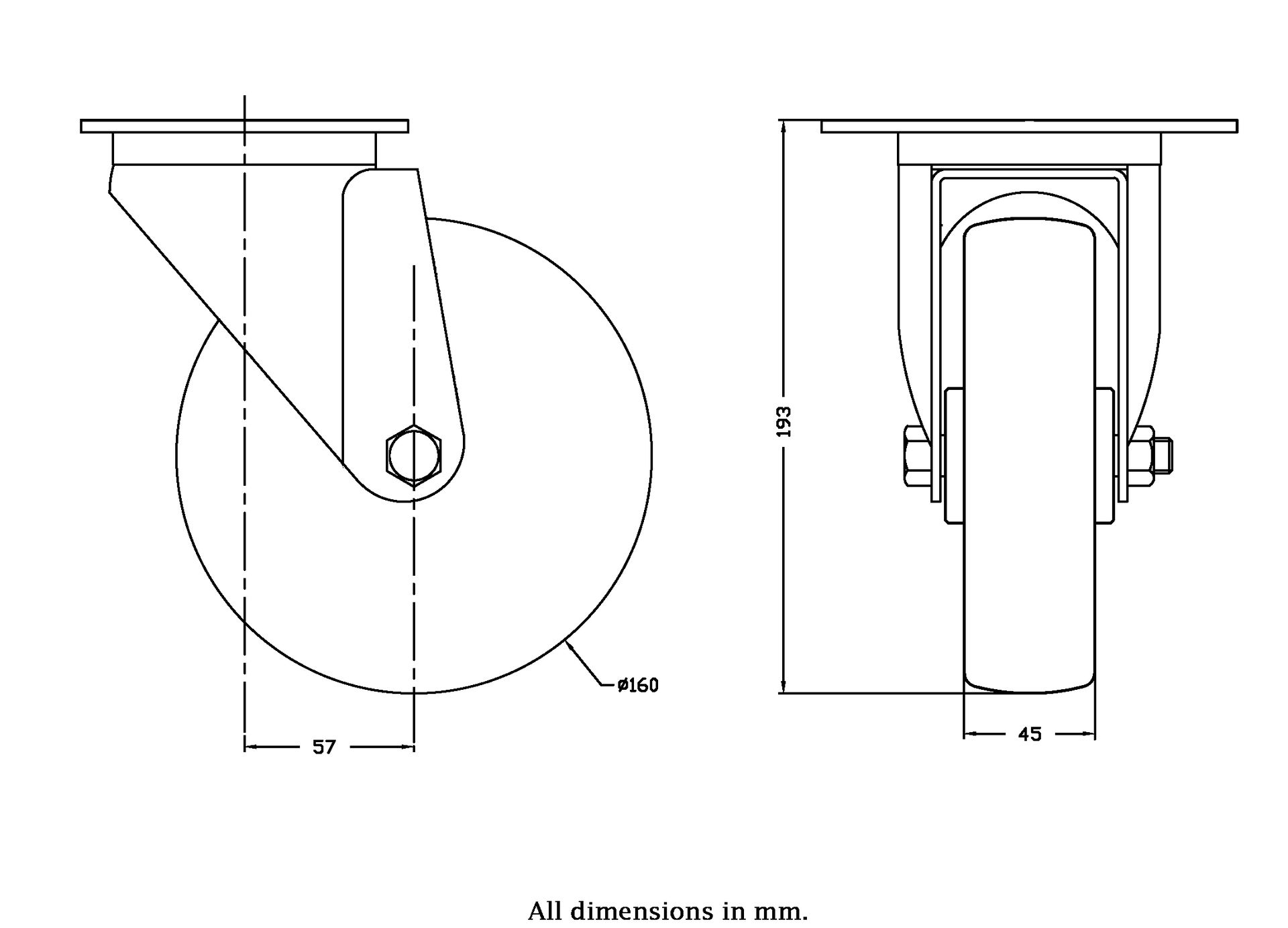 - Swivel castor with top plate bracket made of zinc plated steel with double row ball race in swivel head and dust protection ring.