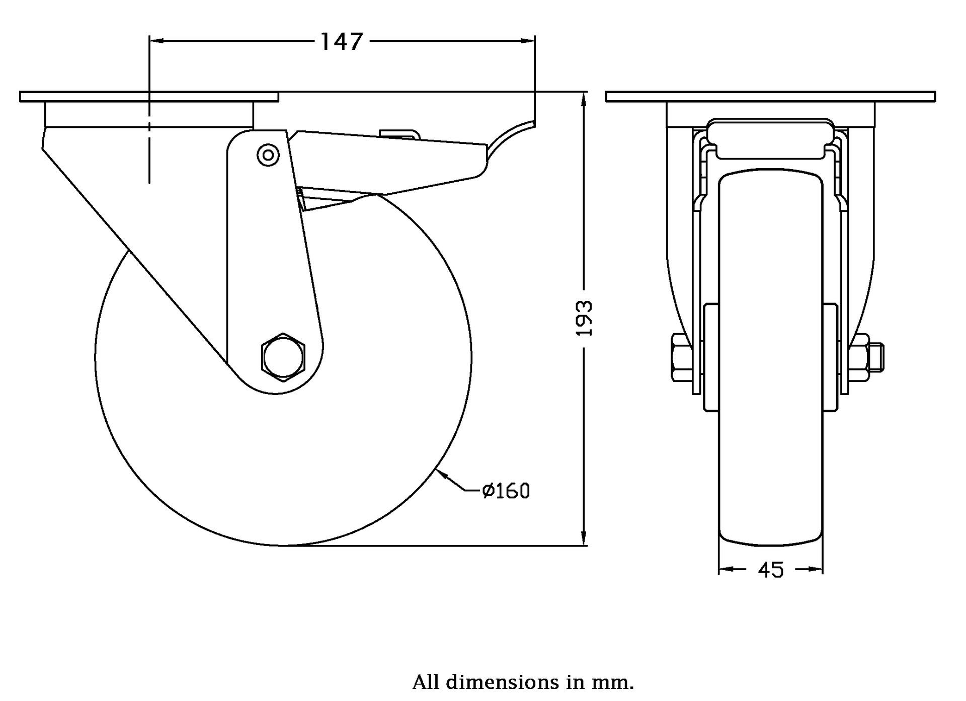 - Swivel/brake castor with top plate bracket made of zinc plated steel with double row ball race in swivel head and dust protection ring.