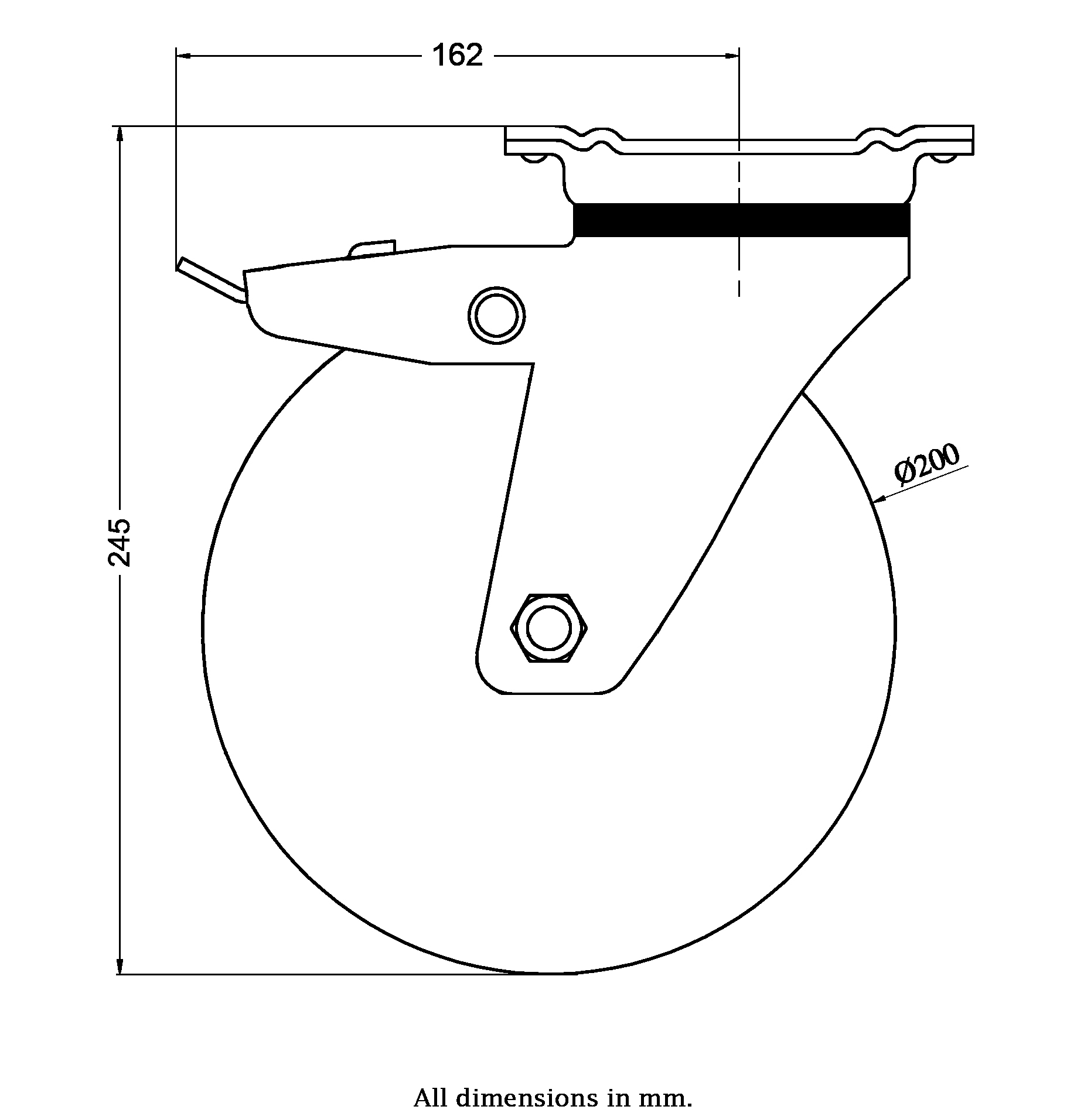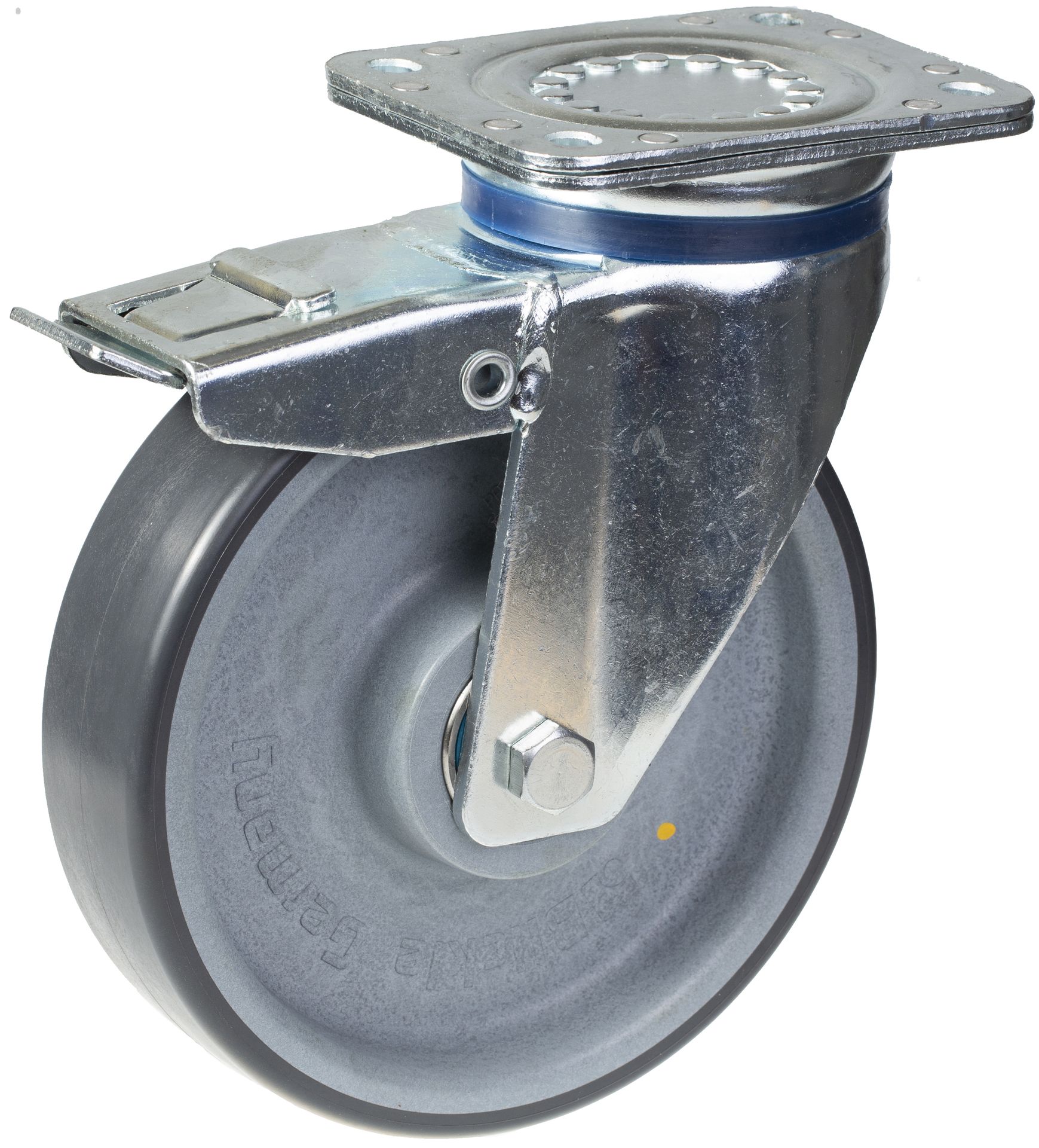 Swivel/brake castor with strong top plate bracket made of zinc plated steel with sealed hardened double row ball race in swivel head, grease nipple and dust protection ring.