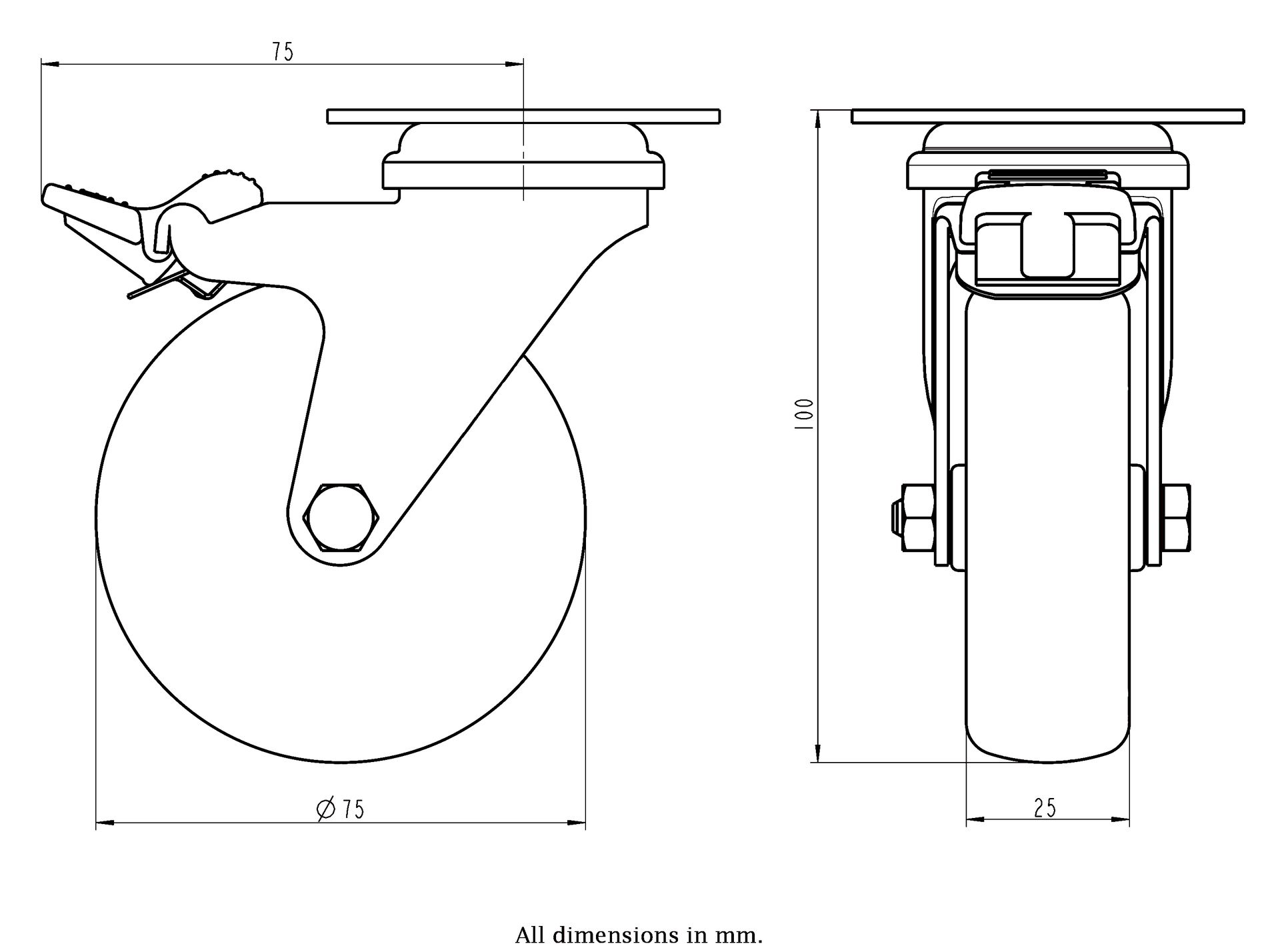 Foot operated brake that locks both swivel and wheel simultaneously.